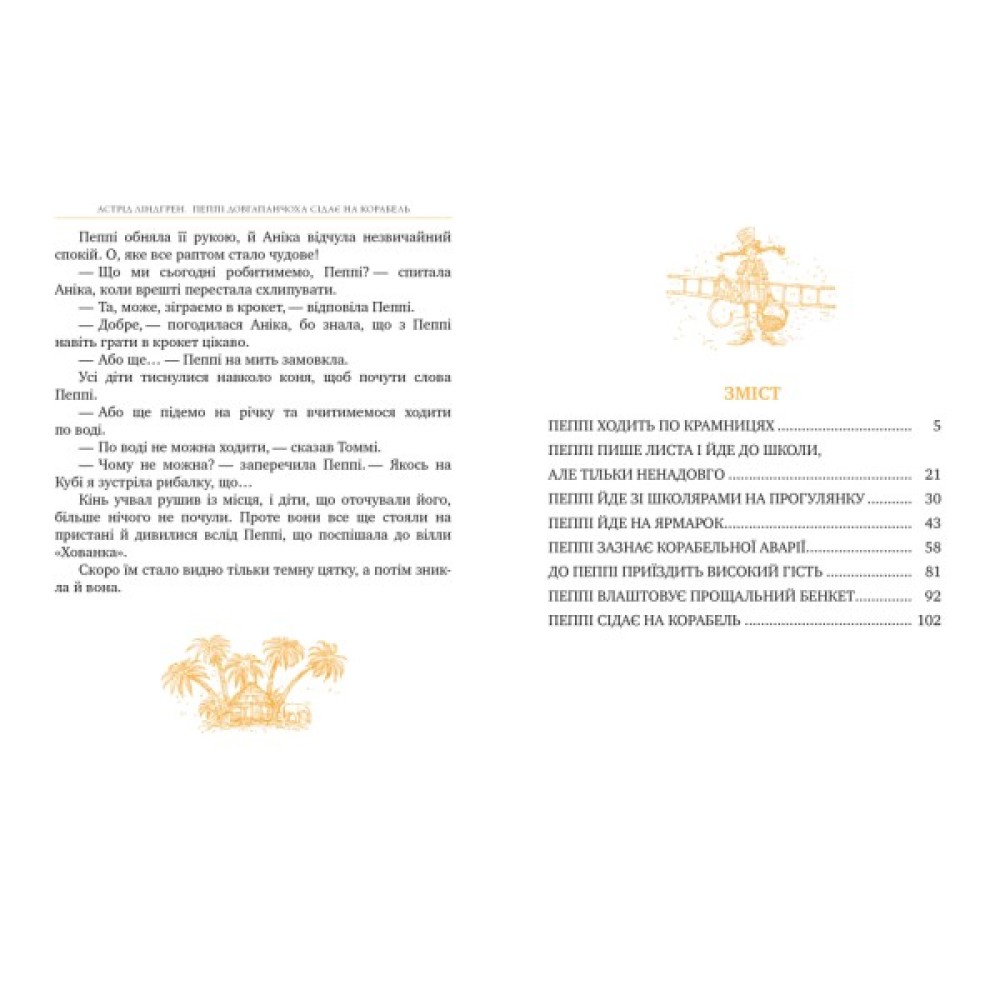 Повість «Пеппі Довгапанчоха сідає на корабель» — це продовження пригод рудої фантазерки та її друзів Томмі й Аніки. Цього разу ти дізнаєшся, як дивовижно Пеппі ходила по крамницях і до школи, як діти опинилися на безлюдному острові, як на віллу «Хованка» завітав гість та багато інших цікавинок. Адже із Пеппі сумувати ніколи!