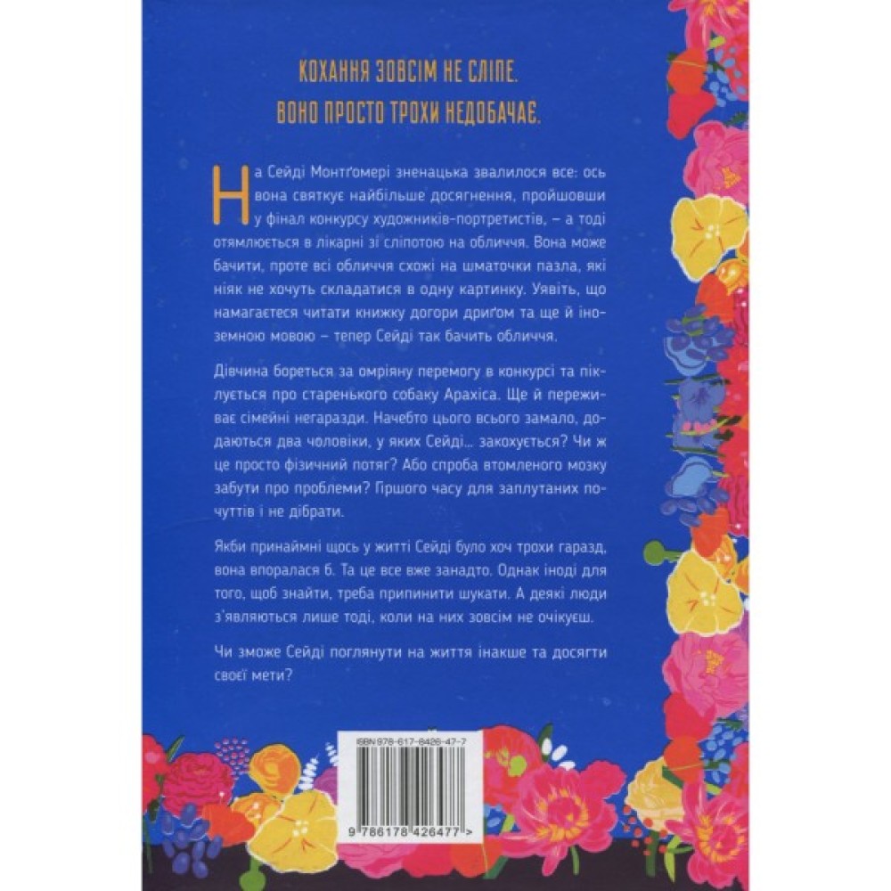На Сейді Монтґомері зненацька звалилося все: ось вона святкує найбільше досягнення, пройшовши у фінал конкурсу художників-портретистів, — а тоді отямлюється в лікарні зі сліпотою на обличчя. Вона може бачити, проте всі обличчя схожі на шматочки пазла, які ніяк не хочуть складатися в одну картинку. Уявіть, що намагаєтеся читати книжку догори дриґом та ще й іноземною мовою — тепер Сейді так бачить обличчя.