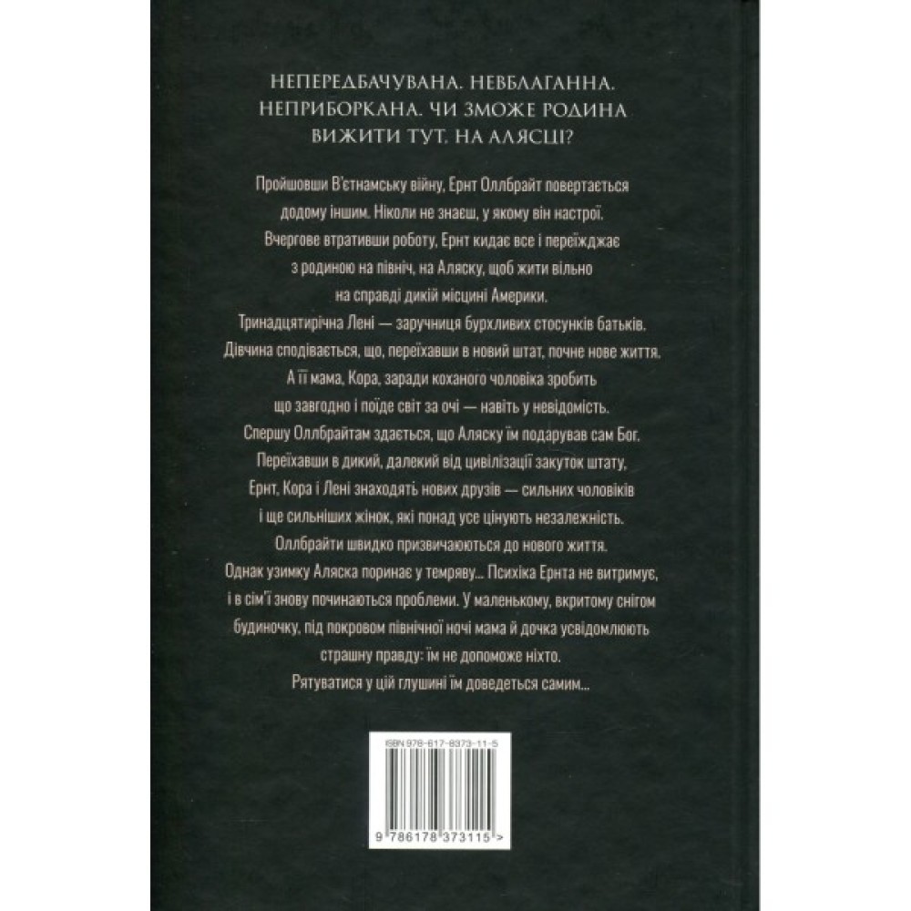 Крістін Генна влучно описує слабкість і стійкість людини, майстерно змальовує незламний дух американських першопрохідців та атмосферу вже напівзниклої Аляски — незрівнянно прекрасної і невблаганно небезпечної землі.
