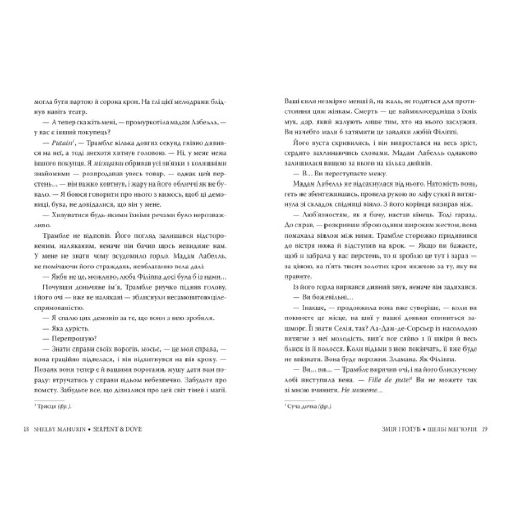 «Блискучий дебют, у якому є все, що я люблю: яскрава, вповні реалізована головна героїня, вигадлива й смертельно небезпечна система магії, а також палка історія кохання, якою я зачитувалася допізна. “Змія і голуб” — не книга, а справжнісінький діамант». — Сара Дж. Маас.