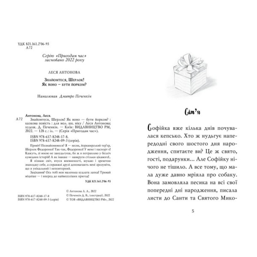 Привіт! Познайомимося? Я — песик, йоркширський тер’єр, Шерлок Федоренко! Так-так, Федоренко! У мене і паспорт є! Кажуть, зі мною не занудьгуєш, бо ж я потрапляю у безліч кумедних історій! А як інакше — навкруги стільки цікавого!..