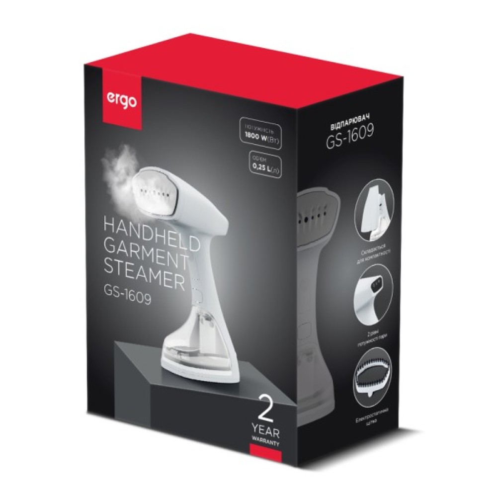 Відмінною перевагою відпарювача Ergo GS-1609 є компактні розміри та легка вага, а отже й можливість брати пристрій із собою у відрядження чи відпустку й носити ошатний одяг будь-де і будь-коли.