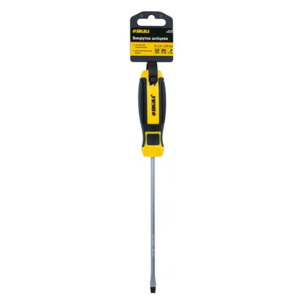 Викрутка Sigma шліцева SL 5.0x150мм CrV Mega (4009231) є надійним інструментом для широкого спектру робіт. Завдяки стандартному (фіксованому) типу конструкції вона підходить для різноманітних застосувань, забезпечуючи точність і стабільність. Плоский наконечник (SL) діаметром 5.0 мм дозволяє ефективно працювати з різними кріпленнями. Магнітний наконечник спрощує процес закручування та витягування гвинтів, тримаючи їх на місці. Рукоятка виготовлена з пластику та гуми, що забезпечує комфорт та надійне зчеплення під час роботи. Довжина викрутки становить 150 мм, що робить її зручною для досягнення важкодоступних місць. Виконана з високоякісної сталі CrV, викрутка гарантує довговічність і стійкість до зносу. Це ідеальний інструмент для професійного та побутового використання.
