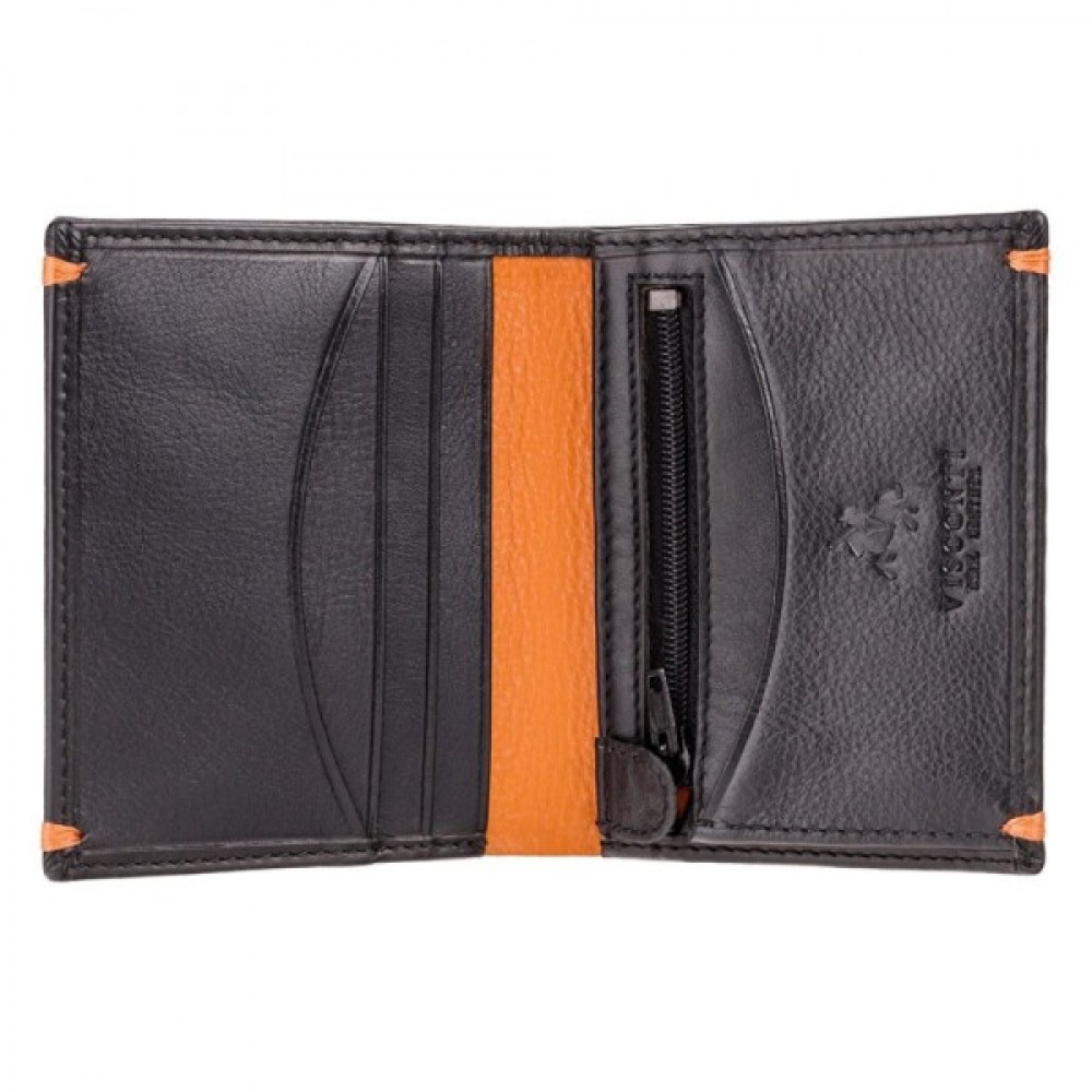 Чоловічий вертикальний гаманець із м'якої матової телячої шкіри. Оригінальне оздоблення ниткою благородного винного кольору на лицьовій стороні та контрастна внутрішня частина. Компактна модель із мінімальною кількістю відділень. Є невелика монетниця на блискавці.