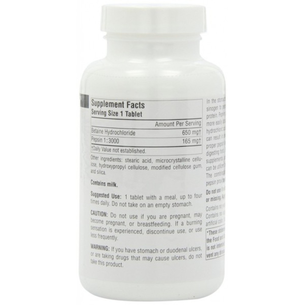 У шлунку соляна кислота перетворює пепсиноген в пепсин, фермент, який руйнує білок. Пепсин руйнує білки в більш дрібні, легко засвоювані речовини. Оскільки люди старіють, секреція соляної кислоти може бути зменшена, що може привести до зниження рівня пепсину. Без правильного рівня пепсину організму важко перетравлювати їжу. Бетаїн гідрохлорид використовується в якості додаткового джерела соляної кислоти, яка може бути використана шлунком для виробництва пепсину. Комбінація бетаїна гідрохлориду та пепсину забезпечує чудовий тонус шлунка.