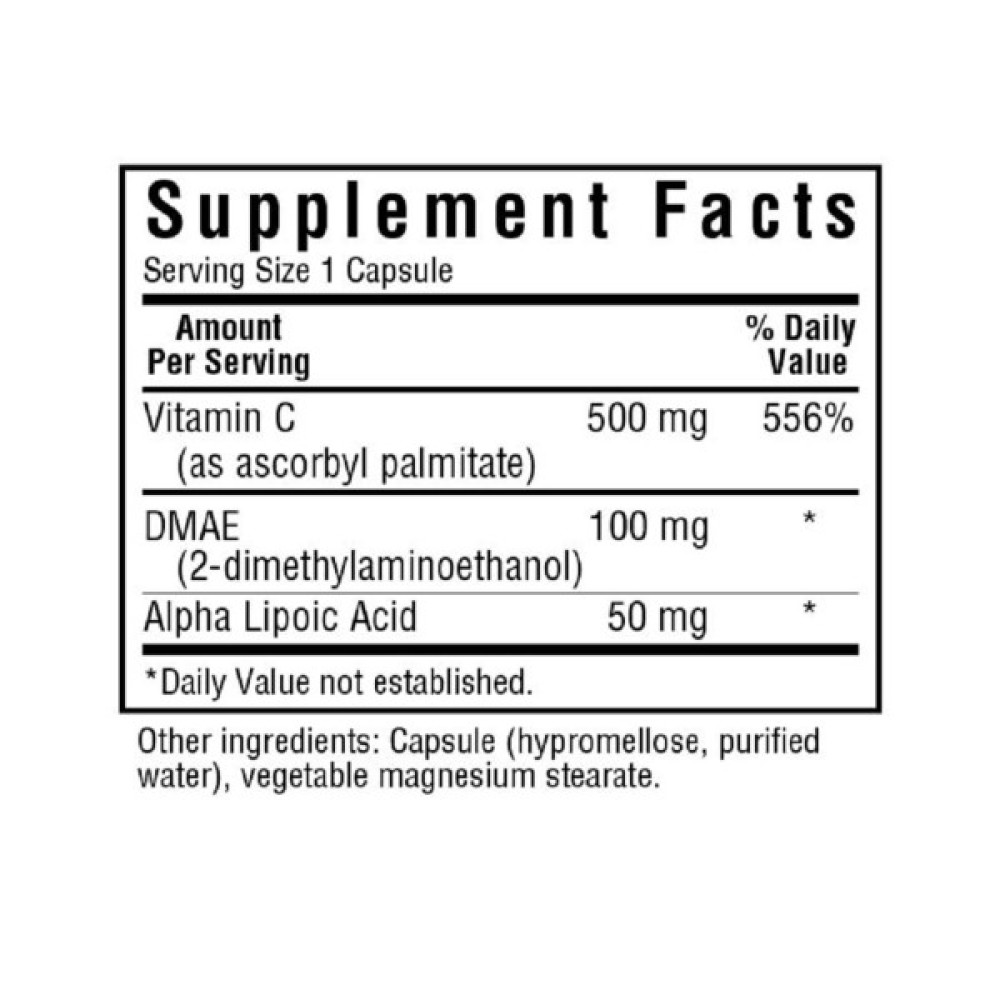 Комплекс містить п'ять основних інгредієнтів, які разом живлять шкіру і підтримують її здоровою. Аскорбил пальмітат, компонент, являє собою жиророзчинний вітамін С, який сприяє здоровій антиоксидантної активності в шкірі і підтримує цілісність колагену. Альфа-ліпоєва кислота - потужний жиро-і водорозчинний антиоксидант, який допомагає реціркуліровать антиоксидантні вітаміни С і Е. Як антиоксидант, вітамін С руйнує вільні радикали, які можуть пошкодити волосся, шкіру і нігті. У формулі також міститься DMAE, який підвищує пружність шкіри.