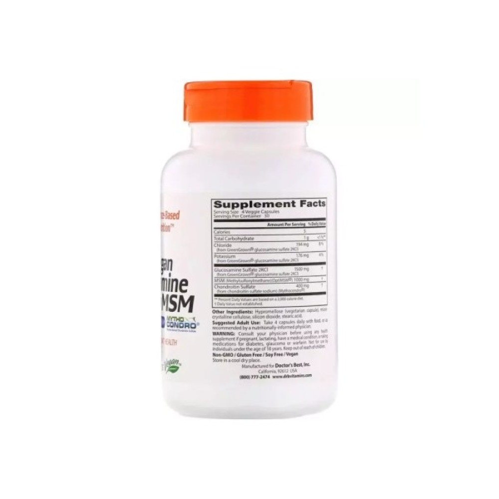 Хондропротекторна формула від компанії Doctor's Best розроблена спеціально для вегетаріанців. Вона включає в себе основні інгредієнти для підтримки здоров'я суглобів: Глюкозамін сульфат - рослинного походження, очищена Сірка (OptiMSM) і вегетаріанський Хондроітин (з Mythocondro) - який має біодоступність на 40% більшу, ніж той же хондроітин тваринного походження.