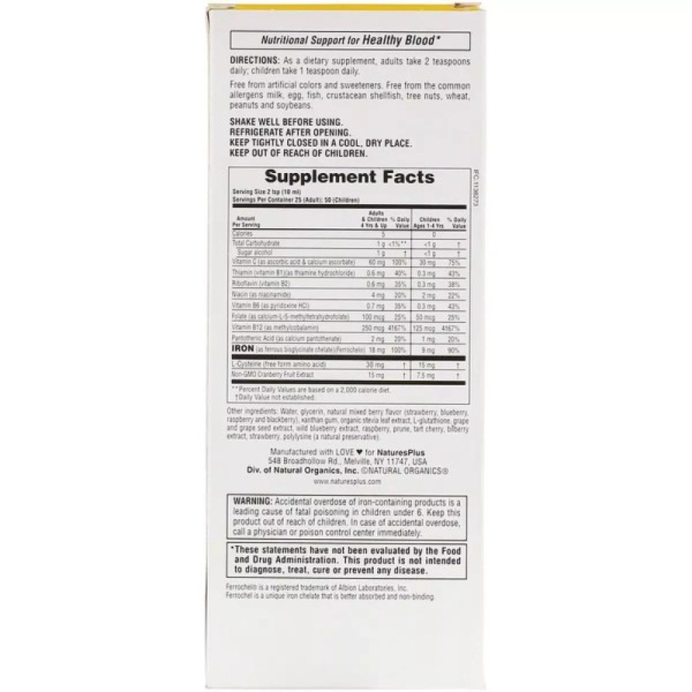 Дефіцит заліза вважається однією з головних проблем зі здоров'ям у всьому світі. Але її можна легко і швидко усунути додатково вживаючи харчові добавки на основі цього елементу. Симптоми дефіциту заліза можуть включати: нестачу енергії, фізичну слабкість, блідий тон шкіри, темні кола під очима, витончення волосся, ламкі нігті, задишку, холодні руки і ноги. Рідке залізо Hema-Plex від Nature's Plus це м'який і ефективний спосіб підвищити рівень заліза, одночасно покращуючи загальний стан крові. У формулу комплексу входять такі важливі для здоров'я крові елементи, як залізо, вітамін С і вітаміни групи В, а також фолієва кислота. Залізо і вітамін В12 входять до складу гемоглобіну. Це білок, з якого складаються еритроцити. Залізо відповідає за захоплення кисню. Потім, за допомогою вітаміну В12 кисень розходиться по кровотоку і поставляється в усі органи в людському тілі. Еритроцити також відповідають за збір вуглекислого газу і переміщення його в легкі для усунення з організму. Вітаміни групи В, а також аскорбінова кислота зміцнюють стінки судин, тим самим перешкоджаючи виникненню різного роду кровотеч. Даний комплекс посилено многоми вітамінами і мінералами. які наситять кров всім необхідним для загального здоров'я.