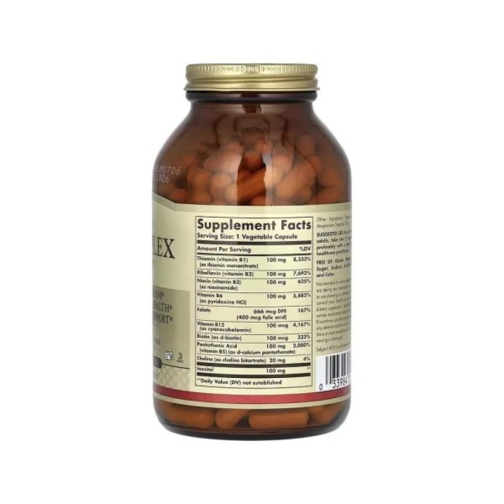 B-Complex "100" від Solgar забезпечує всі водорозчинні вітаміни групи В, які відіграють важливу роль в клітинному метаболізмі. Колись ця група вважалася одним вітаміном. Пізніше дослідження показали, що вони є окремими складовими, які часто співіснують в одних і тих же продуктах. Добавки, що містять всі вісім вітамінів групи В (тіамін, рибофлавін, ніацин, піридоксин, кобаламин, біотин, фолат, пантотенова кислота), називаються комплексом вітаміну В.