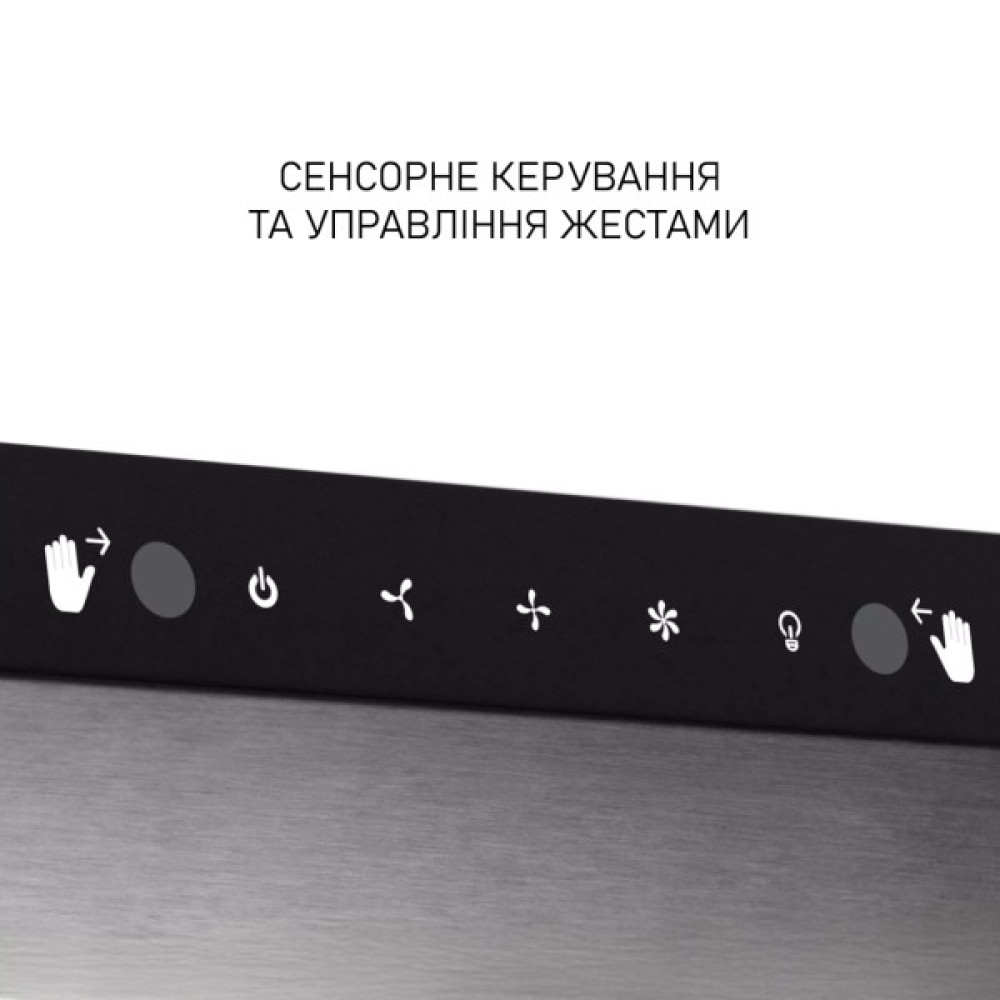 - Управління жестами та сенсорна панель забезпечують сучасний рівень комфорту без необхідності фізичного контакту з поверхнею витяжки.