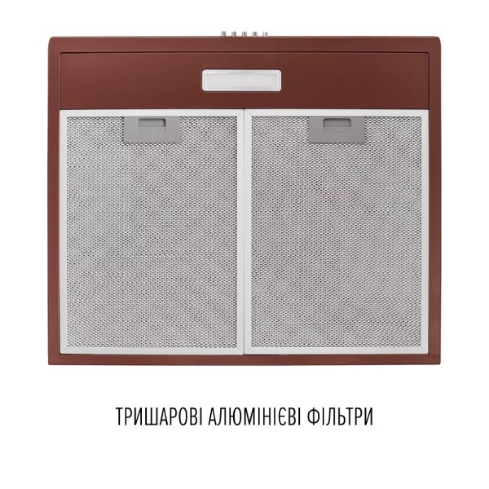 Корпус витяжки виготовлений зі сталевого листа з матовим порошковим фарбуванням, що забезпечує зносостійкість і легкий догляд. Коричневий колір корпусу чудово поєднується з пастельною або дерев’яною кухонною палітрою.