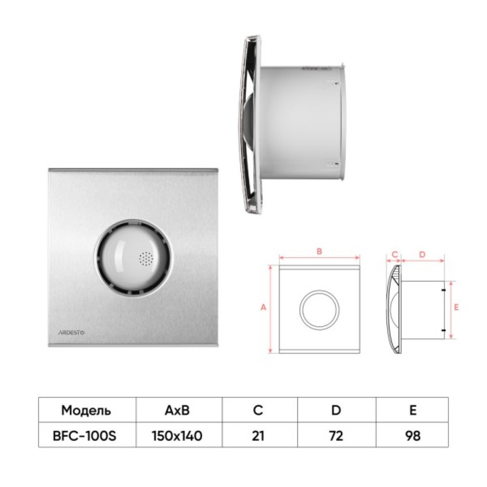 Легкий монтаж без помилокЩодо конструкції: за висоти 150 мм глибина стінок вентилятора становить 21 мм, а короба – 71 мм. Діаметр короба – 98 мм, тож діаметр отвору в поверхні має бути 100 мм – жодних складних розрахунків.