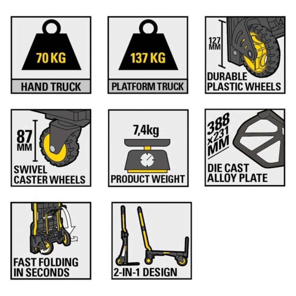 Візок вантажний розкладний Stanley 70/137кг (SXWT-FT585) легкий і універсальний у використанні, завдяки своїй міцній і довговічній конструкції. Надійність і стабільність при роботі забезпечуються завдяки виготовленню основних елементів з високоякісної сталі. Виготовлені з міцного нейлону основні пластикові точки напруги, а інші пластикові частини – з поліпропілену, що забезпечує тривалість роботи конструкції.