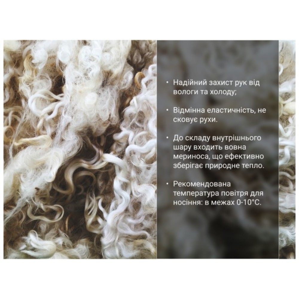 • Внутрішній шар забезпечує м'якість та комфорт для чутливої шкіри. Склад: акрил (40%), нейлон (20%), вовна мериноса (40%), яка зберігає тепло та відводить піт.