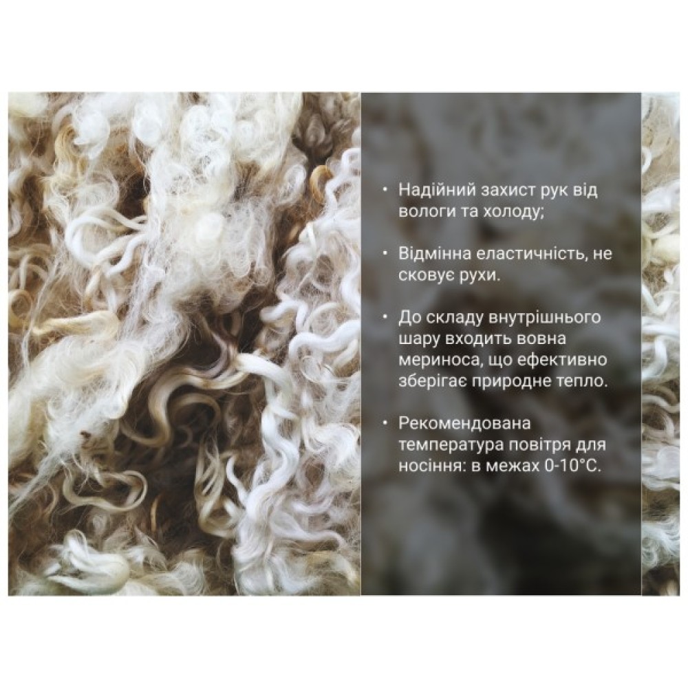 Внутрішній шар дарує рукам м'якість, гарантуючи чутливій шкірі долонь комфорт під час тривалого носіння. До його складу входять акрил (40%), нейлон (20%), а також натуральна вовна мериноса (40%), яка характеризується відмінними теплозберігаючими показниками, а також здатністю швидко відводити піт зі шкіри.