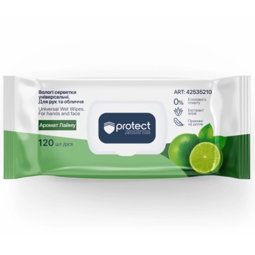 Універсальні вологі серветки Protect призначені для щоденного очищення рук та обличчя. М’яко та ефективно видаляють забруднення, освіжають шкіру та дарують приємний аромат лайма.