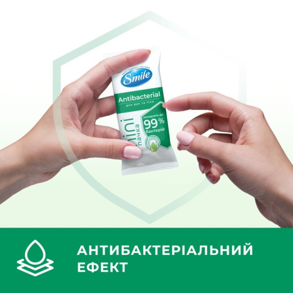 Вологі серветки Smile Antibacterial безпечно й ефективно очищають шкіру рук і тіла, надаючи їй відчуття свіжості.