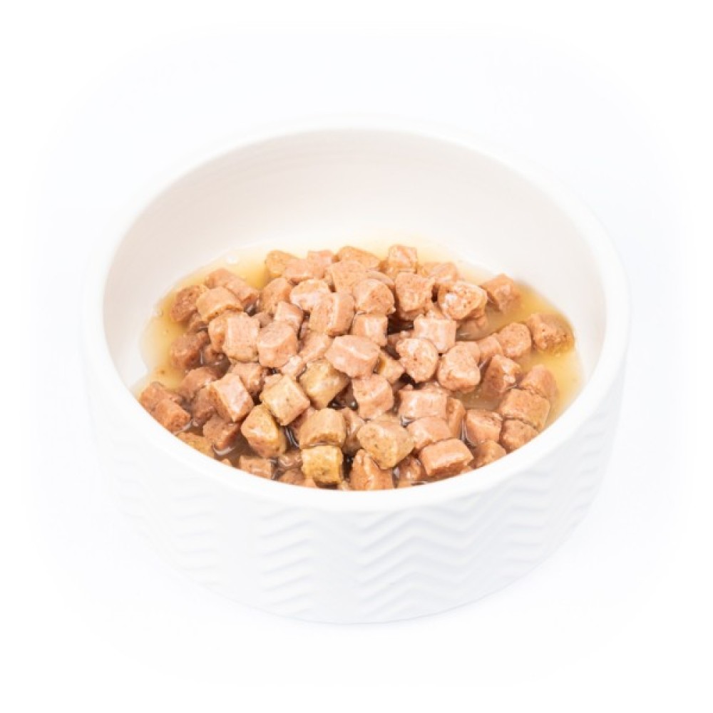Шматочки білої риби (9,3%) у ніжному соусі створюють справжню гастрономічну насолоду, а високий вміст м'яса (75%) забезпечує збалансоване харчування. Вітаміни D3 та E, разом з таурином, підтримують здоровий розвиток кошеняти.