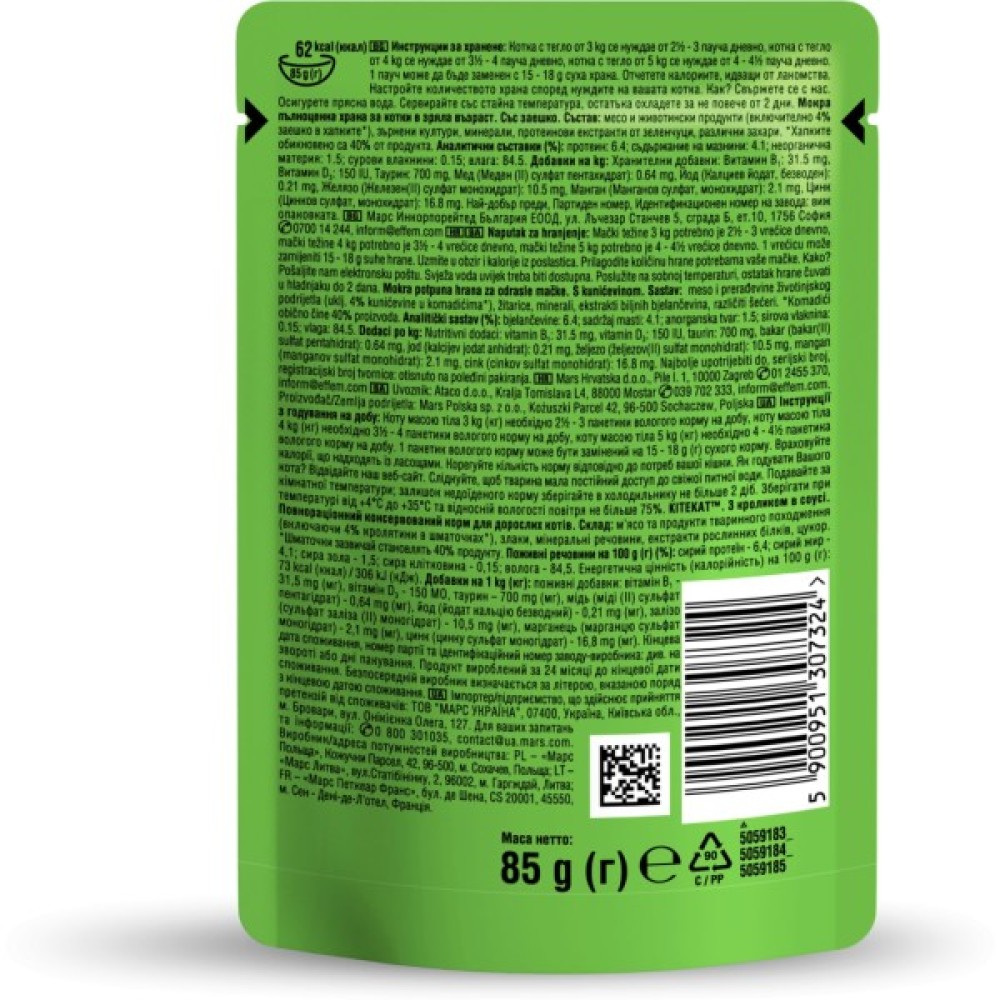 Вологий корм для кішок Kitekat з кроликом у соусі — ідеальний вибір для дорослих котів із чутливим травленням. Завдяки збалансованому складу, цей повнораціонний консервований корм забезпечує всі необхідні поживні речовини. Основний інгредієнт — кролик, що забезпечує м'який смак та легке засвоювання.