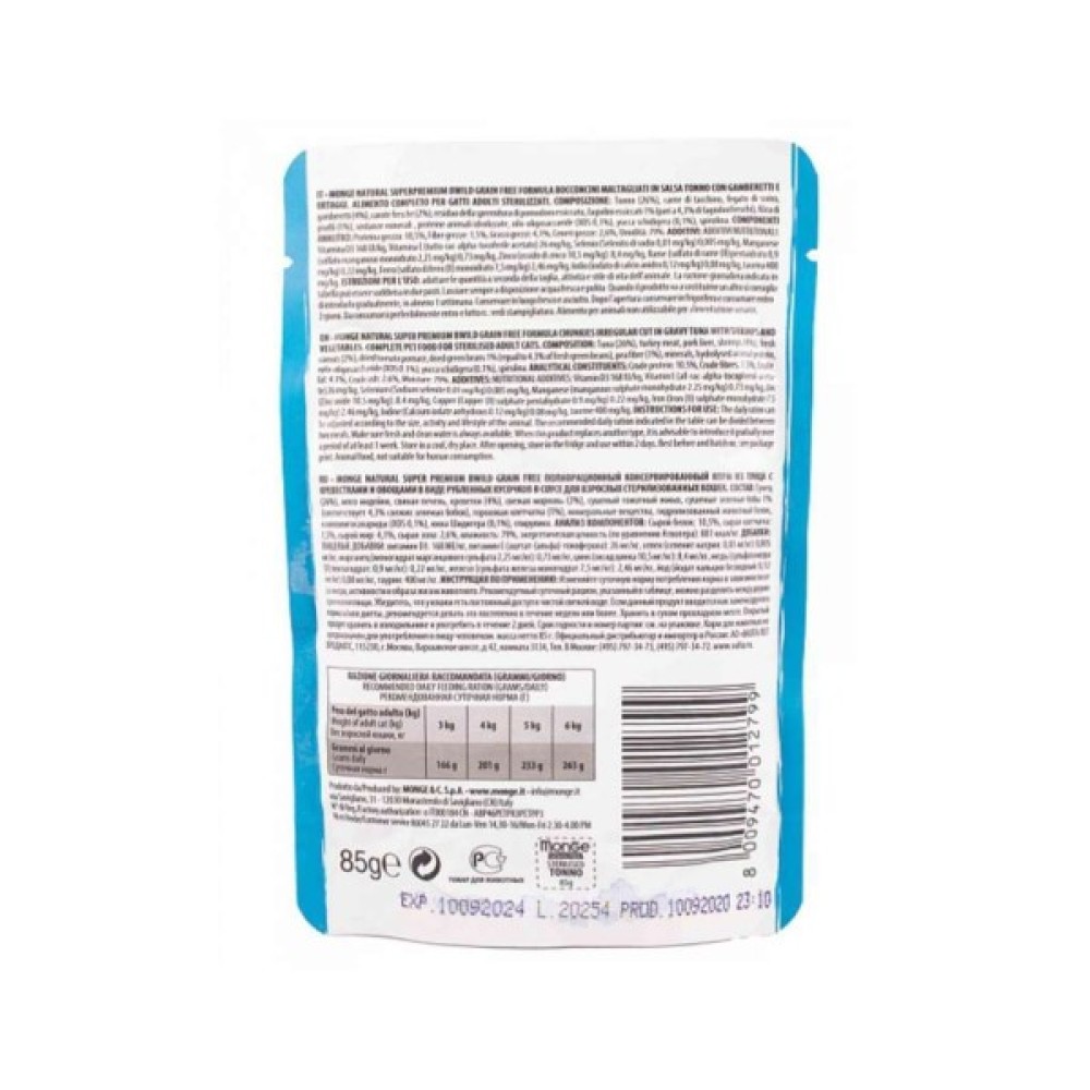 Вологий корм для кішок Monge BWild Cat Free Wet Sterilized тунець з креветками – це ідеальний вибір для вашого улюбленця після стерилізації чи кастрації. Спеціальна беззернова рецептура містить тунець та креветки, що є чудовими джерелами білка та антиоксидантів. Завдяки зниженому вмісту жиру та підвищеній кількості клітковини, корм підтримує оптимальну вагу тварини та запобігає ожирінню.