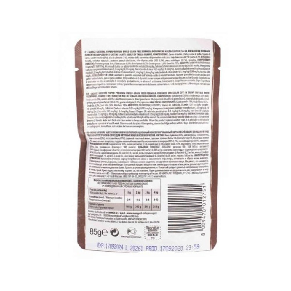 Вологий корм для кішок Monge BWild Cat Free Wet з м'яса буйвола та овочами, вагою 85 г, створений для забезпечення здорового харчування вашого улюбленця. Основу його складу становить м'ясо буйвола, яке відоме своєю високою енергетичною цінністю та багатим вмістом вітаміну РР. Формула корму доповнена овочами, які є джерелом природних мінералів та вітамінів, що покращують апетит і травлення.