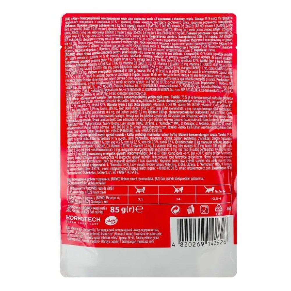 Вологий корм для кішок Мяу! З кроликом в ніжному соусі — це ідеальний вибір для повноцінного живлення вашого улюбленця. Вага упаковки складає 85 г, що робить його зручним для щоденного використання. Завдяки французькій технології виробництва, корм відповідає європейським стандартам якості, забезпечуючи збалансованість поживних речовин. Основні інгредієнти включають 75% м'яса та субпродуктів, зокрема 4% кролика, що сприяє зміцненню обміну речовин та підтримці здорова шерсть і фізичний розвиток. Унікальність рецептури дозволяє задовольнити фізіологічні потреби та приносить задоволення від приймання їжі. Надійне вакуумне упакування зберігає корм свіжим, як щойно приготовлений.