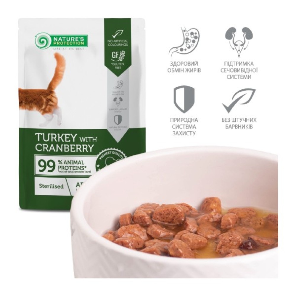 Nature’s Protection Sterilised, Turkey with Cranberry – це супер-преміум повнораціонний вологий корм для дорослих стерилізованих котів із індичкою та журавлиною у смачному соусі. Спеціальна формула сприяє підтримці здоров’я сечовивідної системи та зміцненню захисних функцій організму, прискорює метаболізм. Основне джерело білка в цьому продукті – високоякісна індичка, що має високу харчову цінність. Корм – м’який і легко пережовується, а склад м’яса та соусу – легкозасвоюваний. Вологий корм Nature’s Protection розроблений із урахуванням різних потреб молодих і дорослих кішок. Спеціальна рецептура дає змогу зберігати натуральний смак і апетитний аромат. Вологий корм, приготований в оптимальному обсязі, зручно використовувати в домашніх умовах, під час подорожей і виставок. Продукт не містить свинини – важкозасвоюваного інгредієнту для домашніх тварин.