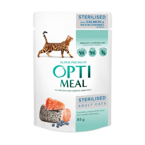 Вологий корм для кішок Optimeal з лососем та чорницею в желе призначений спеціально для стерилізованих кішок та кастрованих котів. Цей повнораціонний консервований корм, вагою 85 г, є ідеальним балансом смаку та користі. Основний інгредієнт - лосось, відомий своїми корисними жирами та білками, які підтримують здоров'я серцево-судинної системи та блискучий вигляд шерсті.