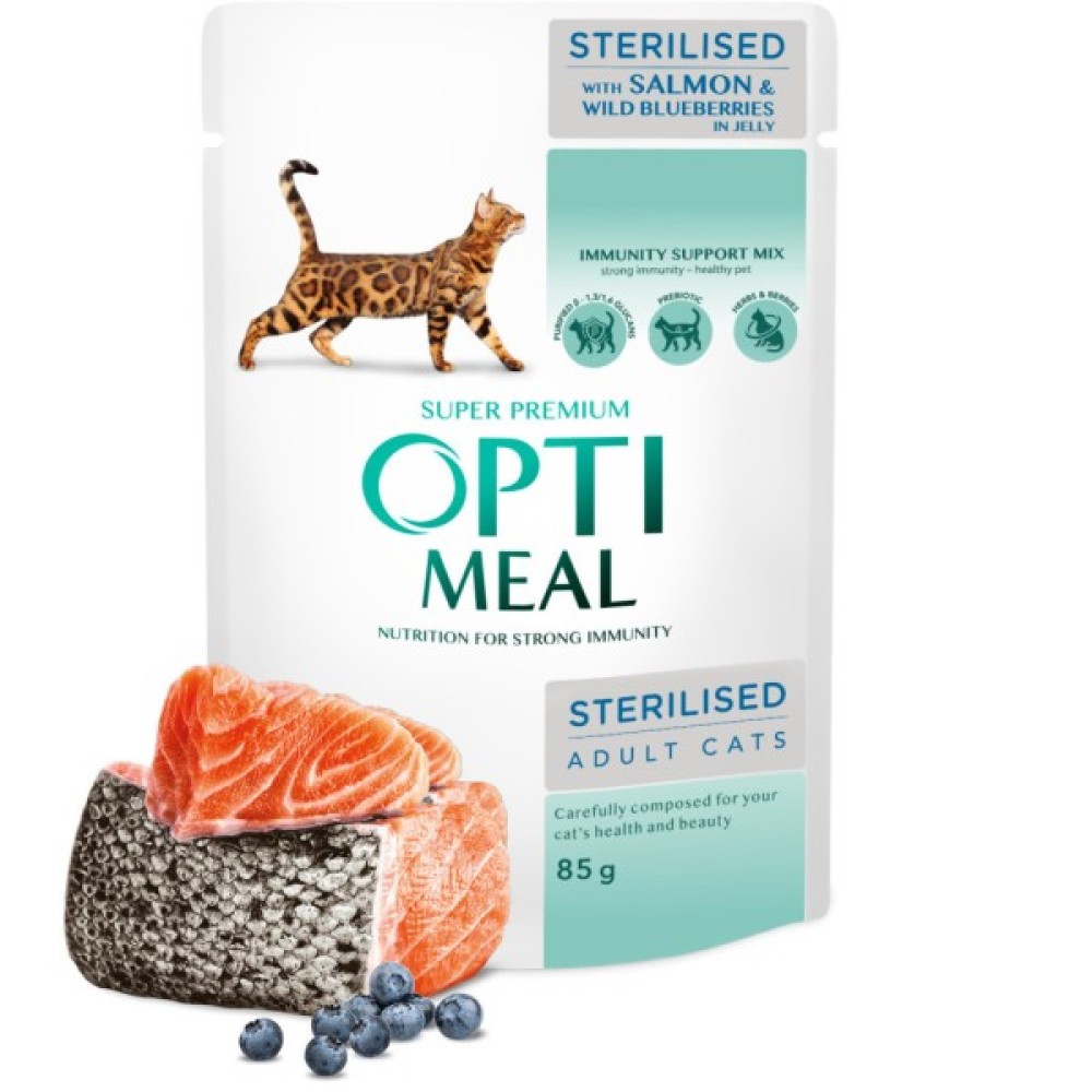 Чорниця, що входить до складу, багата на антиоксиданти, які зміцнюють імунітет. Желе робить прийом їжі приємним і легким для вашого улюбленця. Обираючи Optimeal, ви забезпечуєте своїй тварині високу якість харчування, яка враховує всі потреби після стерилізації чи кастрації.