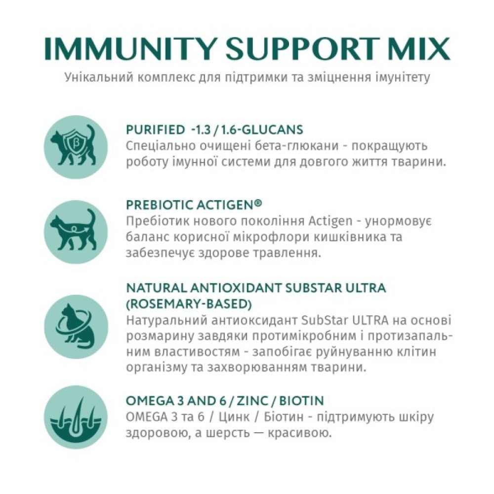 Корм містить пребіотики та природний мікс лікувальних трав, що зміцнюють імунітет вашої кішки. Омега-3 та Омега-6 жирні кислоти піклуються про здоров'я шкіри та блиск шерсті. Збалансований склад з мінералами і вітамінами робить цей корм вдалим рішенням для підтримки загального добробуту вашого пухнастого друга.