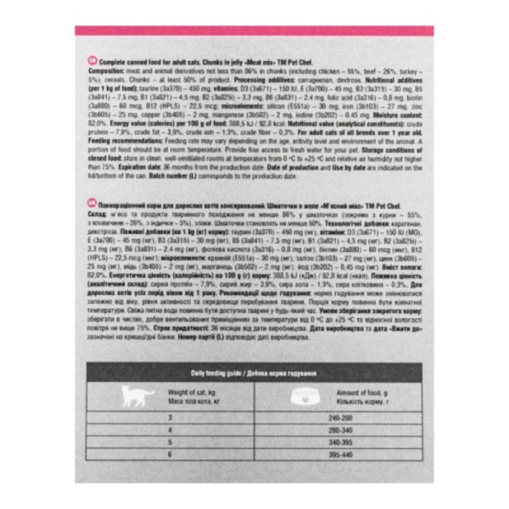Pet Chef відзначається високою якістю без використання барвників і рослинних білків, що робить його ідеальним для щоденного використання. Подаруйте своїй кішці користь і смак кожного дня!