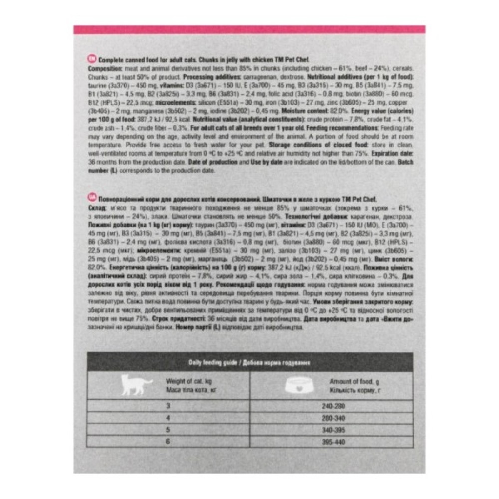 Вологий корм для кішок Pet Chef З куркою 200 г (4820255194066) — це ідеальний вибір для тих, хто бажає забезпечити свого улюбленця справжнім гастрономічним задоволенням. Корм містить шматочки м'яса в ароматному желе, яке сподобається навіть найвибагливішим кішкам. Завдяки високому вмісту м'яса та субпродуктів, зокрема 61% курки та 24% яловичини, корм надає необхідну кількість білків і енергії для активного життя вашого улюбленця.