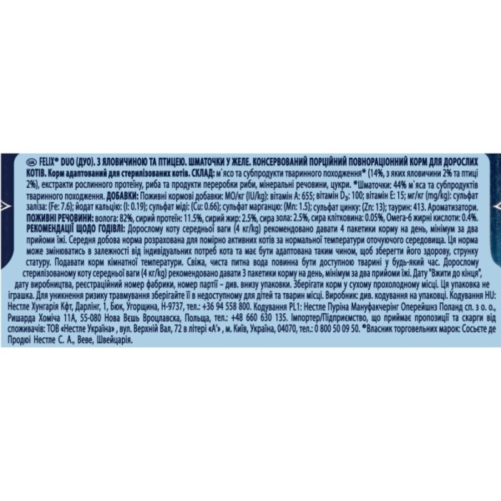 Вологий корм для кішок Purina Felix Fantastic Duo з яловичиною та птицею - справжнє гастрономічне задоволення для вашого улюбленця. Кожен шматочок у ніжному желе виготовлений з високоякісних інгредієнтів, багатих на незамінні Омега-6 жирні кислоти, які підтримують енергію та здоров'я вашої кішки.