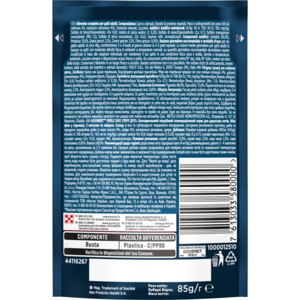 Purina Gourmet Perle Duo не містить штучних барвників, консервантів і ароматизаторів, що робить його здоровим вибором для щоденного годування. Вироблений в ЄС з дотриманням суворих стандартів, цей корм вагою 85 г стане ідеальним частуванням для вашої киці, перетворюючи кожен прийом їжі у справжню насолоду.