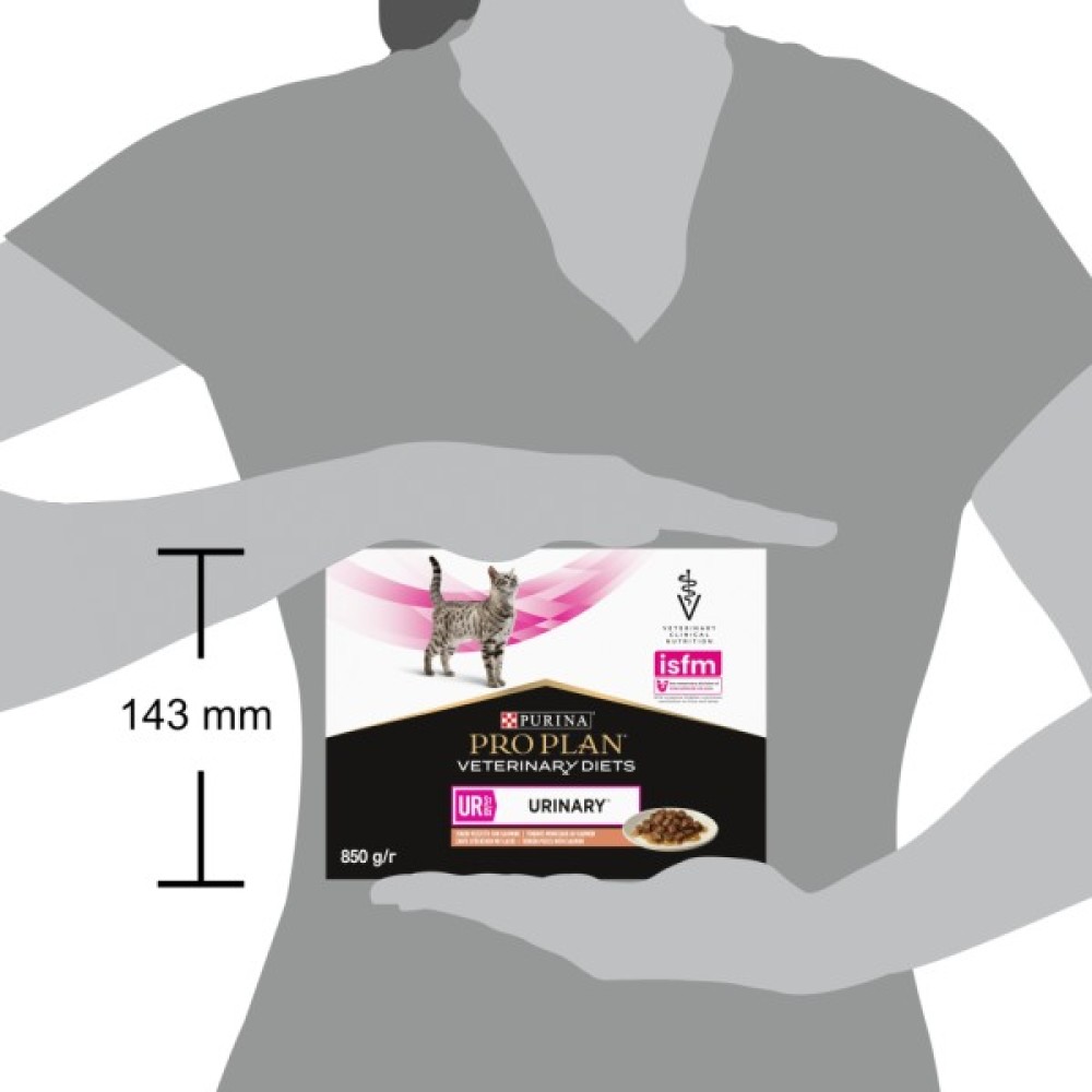 Вологий корм для кішок Purina Pro Plan Veterinary Diets UR ST/OX Urinary з лососем, представлений у зручній упаковці по 10 пакетиків по 85 г, спеціально створений для турботи про здоров'я сечовивідних шляхів улюбленця. Його унікальна формула, що містить високоякісний лосось, ефективно сприяє розчиненню струвітних каменів та знижує ризик утворення оксалатних.