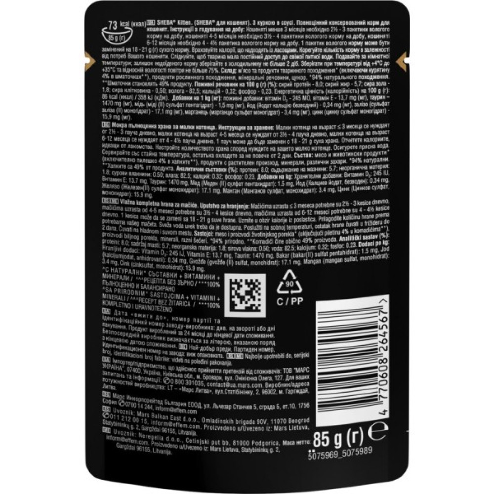 Вологий корм для кішок Sheba з куркою в соусі для кошенят (85 г) створений для забезпечення ваших маленьких улюбленців сбалансованим харчуванням з раннього віку. Курка в ароматному соусі є основним інгредієнтом, доповнена корисними злаками і мінералами, щоб підтримати здоровий ріст та розвиток кошенят. Поживна цінність продукту належним чином поєднує сирий протеїн (8.5%) і сирий жир (4.5%), забезпечуючи енергетичну цінність 347 кДж/83 ккал на 100 г. Цей корм не лише смачний, але й корисний, підтримує природний іммунітет та здоров'я вашого вихованця. Забезпечте котика постійним доступом до свіжої води для максимального задоволення і користі.