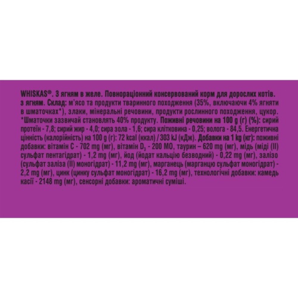Вологий корм для кішок Whiskas Ягня в желе - це смачна страва для вашого улюбленця, спеціально розроблена для дорослих котів з чутливим травленням. Основний інгредієнт - ягня, забезпечує легкість засвоєння і вишуканий смак, який ваш кіт полюбить. Завдяки вітаміну C, корм допомагає підтримувати природний імунітет. Високоякісні протеїни сприяють розвитку сильних м'язів, а цинк піклується про здорову шкіру та шерсть. Унікальна текстура з 40% шматочків у желе зробить кожен прийом їжі справжнім задоволенням. Подаруйте вашому коту радість з Whiskas!