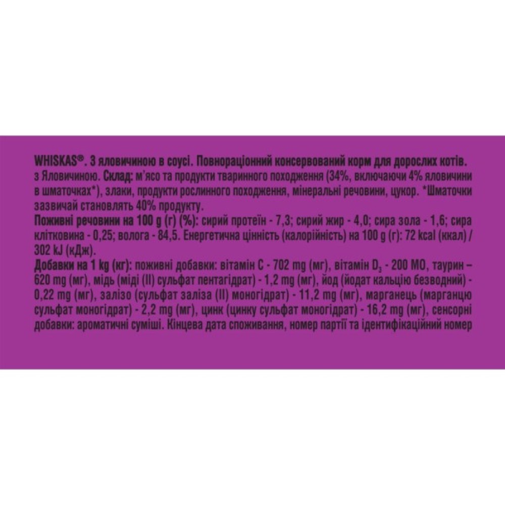 Вологий корм для кішок Whiskas з яловичиною в соусі — досконалий вибір для вашого улюбленця. Цей корм масою 85 г розроблений спеціально для *дорослих котів з чутливим травленням*. Його *основний інгредієнт — яловичина* — забезпечує натуральний смак і поживність. Корм містить високоякісні протеїни для підтримки пружних та сильних м'язів, а вітамін C підвищує *природні захисні сили* організму.