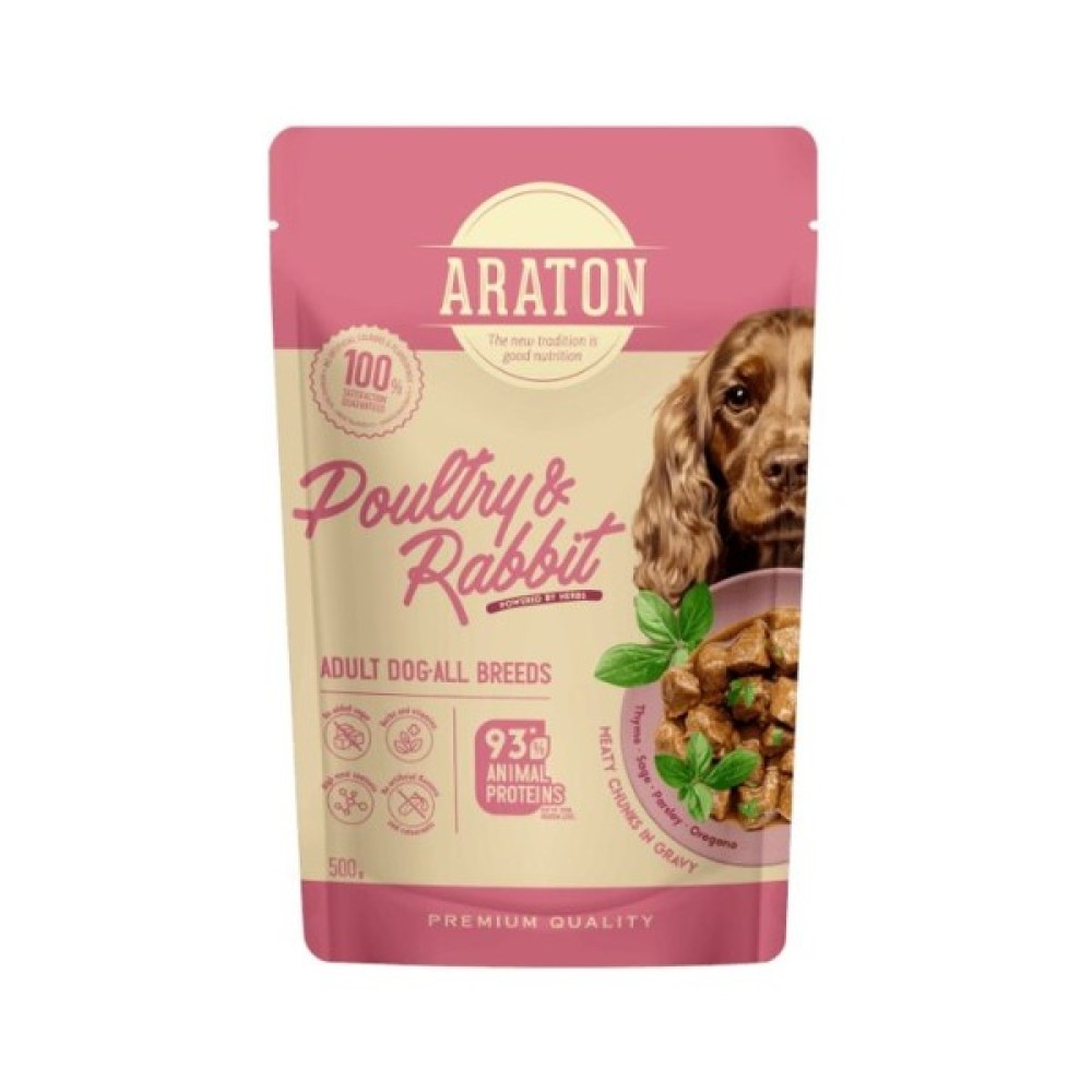 Повноцінний вологий корм Araton з птицею та кролятиною створений для дорослих собак усіх порід від 1 року. Ніжні шматочки в соусі з MOS-пребіотиками, травами та клітковиною – для травлення, ситості та щоденної активності. Формула підтримує енергію, здоров’я травної системи та загальний комфорт собаки.