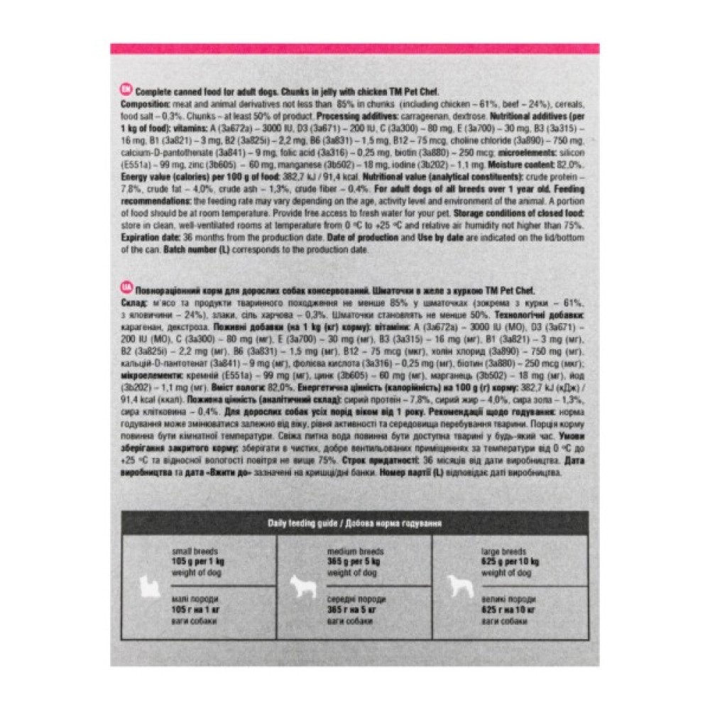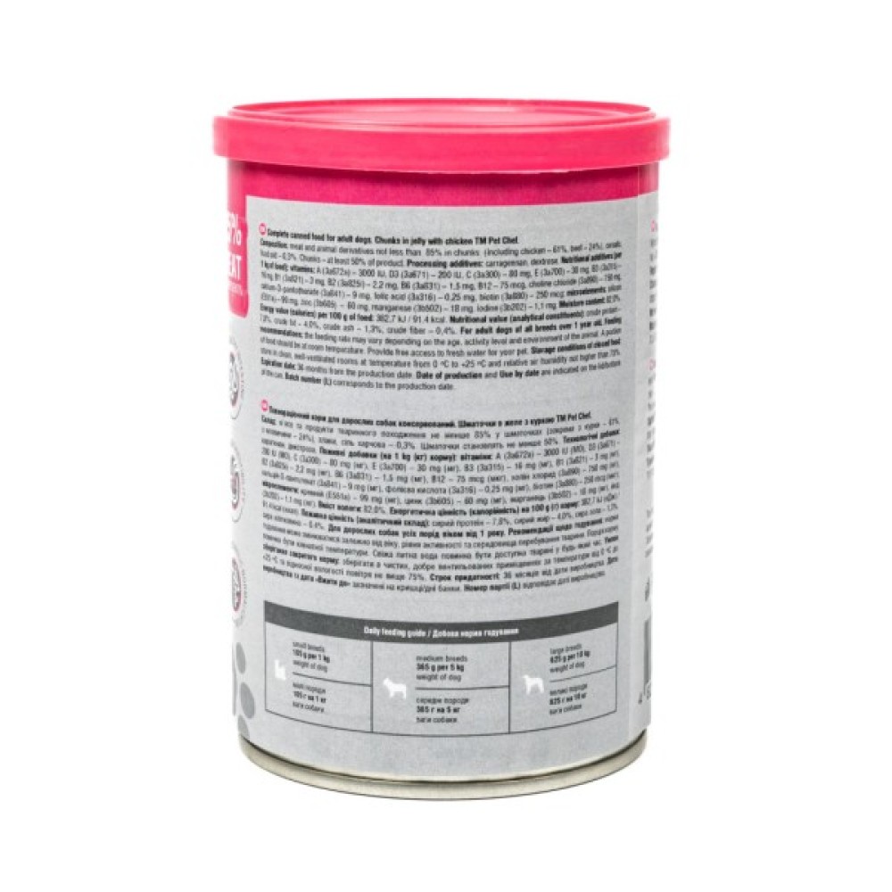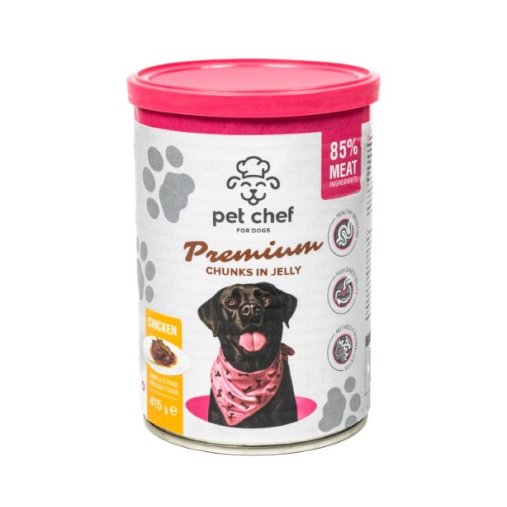 М’ясні шматочки в желе Pet Chef — це збалансований повнораціонний вологий корм для дорослих собак, який є чудовим вибором для тих, хто хоче забезпечити своїх улюбленців смачним та поживним раціоном. Кожен шматочок корму містить мінімум 85% м’ясних інгредієнтів, що задовольнить потреби тварини у білках та енергії, а також оптимальну комбінацію макро- і мікроелементів, вітамінів і амінокислот, необхідних для її розвитку та загального здоров’я. Желе підсилює апетитність, роблячи кожен шматочок надзвичайно соковитим і ароматним.