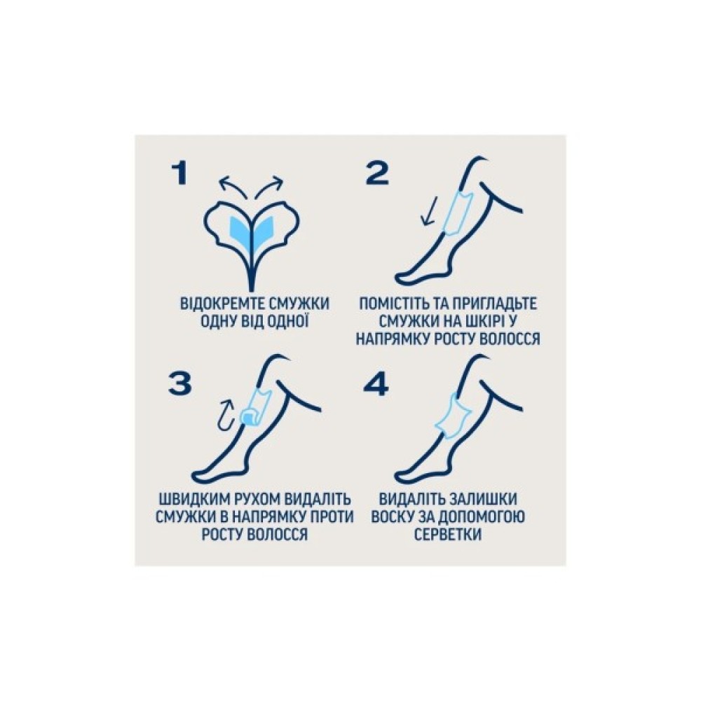 Помістіть смужку на суху ділянку шкіри, розгладжуючи її кілька разів по напрямку росту волосся. Одним швидким рухом видаліть смужку в напрямку проти росту волосся.
