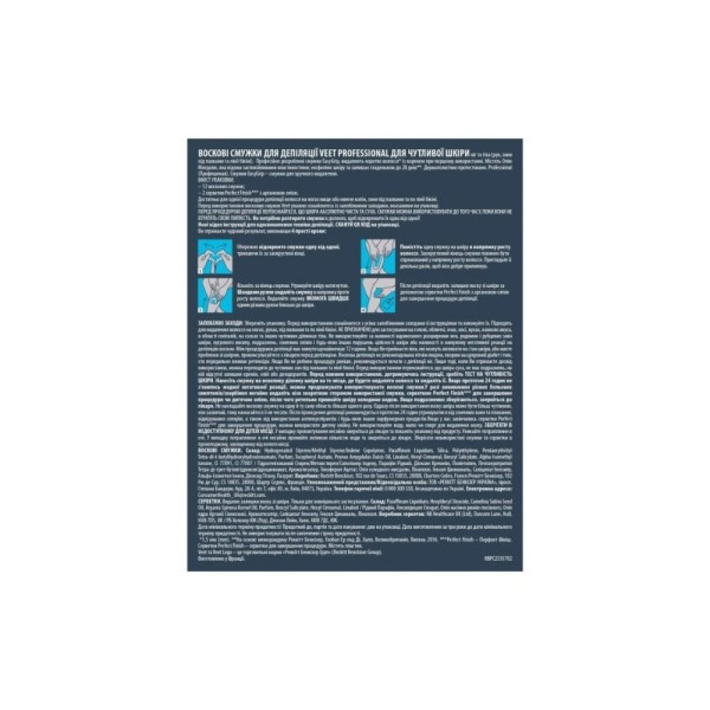 Воскові смужки: Гідрогенізований Стирен/Метилстирен/Сополімер Індену, Парафін Рідкий, Діоксин Кремнію, Поліетилен, Пентаеритритил Тетра-ді-трет-бутилгідроксигідроциннамат, Ароматизатор, Токоферил Ацетат, Олія солодкого мигдалю, Ліналоол, Гексил Циннамаль, Саліцилат бензилу, Альфа-Ізометил Іонон, Діоксид Тітану, Лазурит. Серветки: Видаляє залишки воску зі шкіри. Тільки для зовнішнього застосування. Склад: Рідкий Парафін, Гексилдецил Стеарат, Олія насіння рижію посівного, Олія ядра Арганії Спиноз