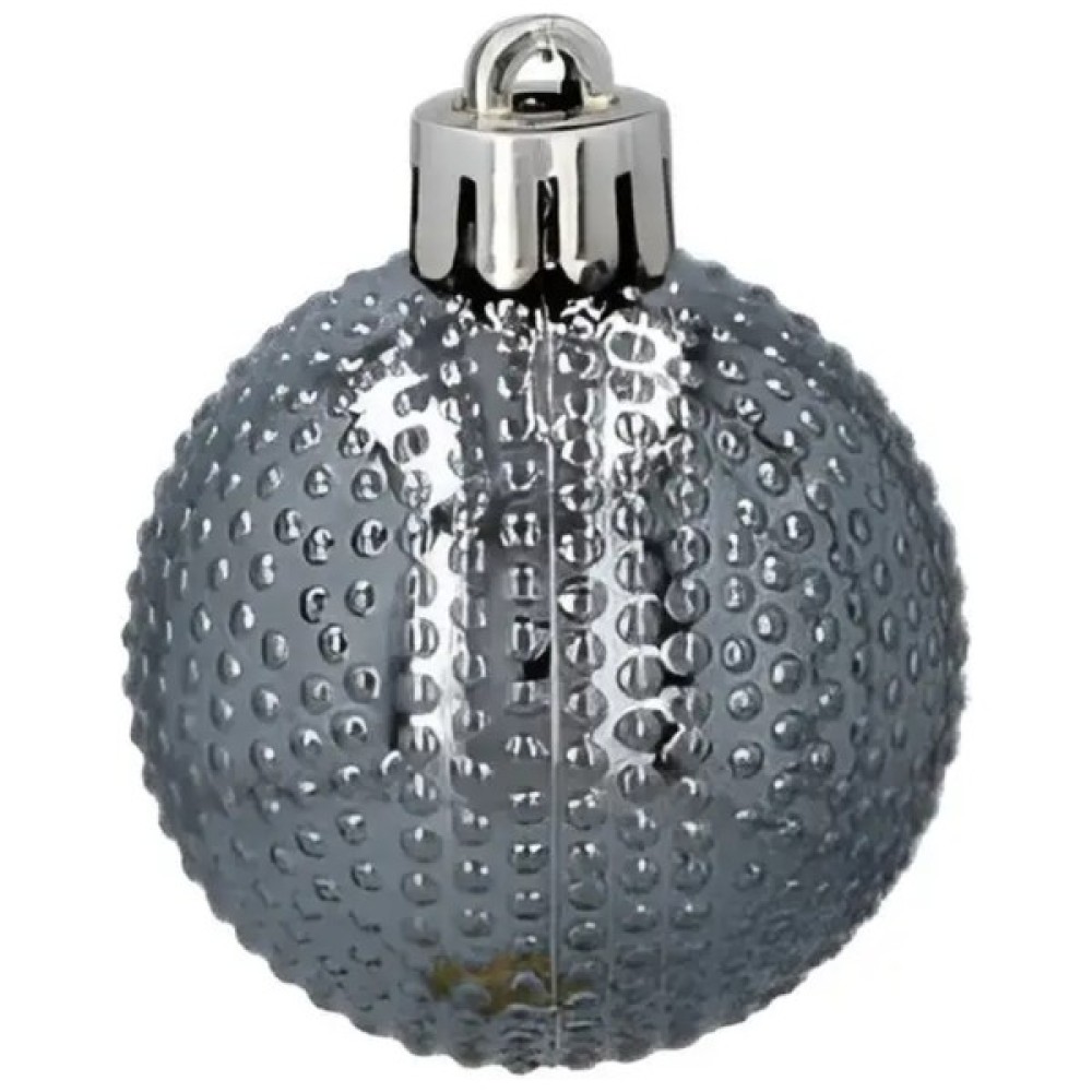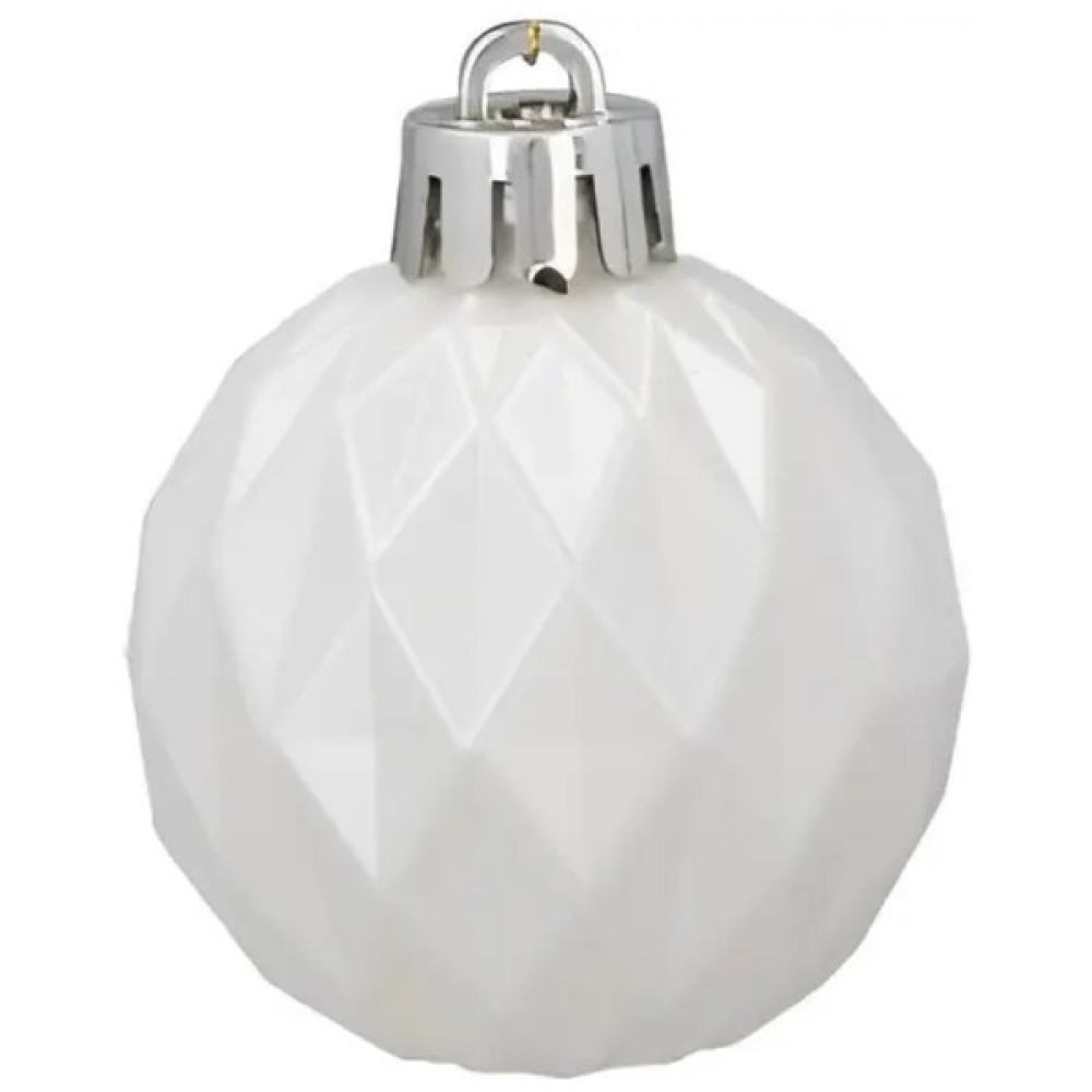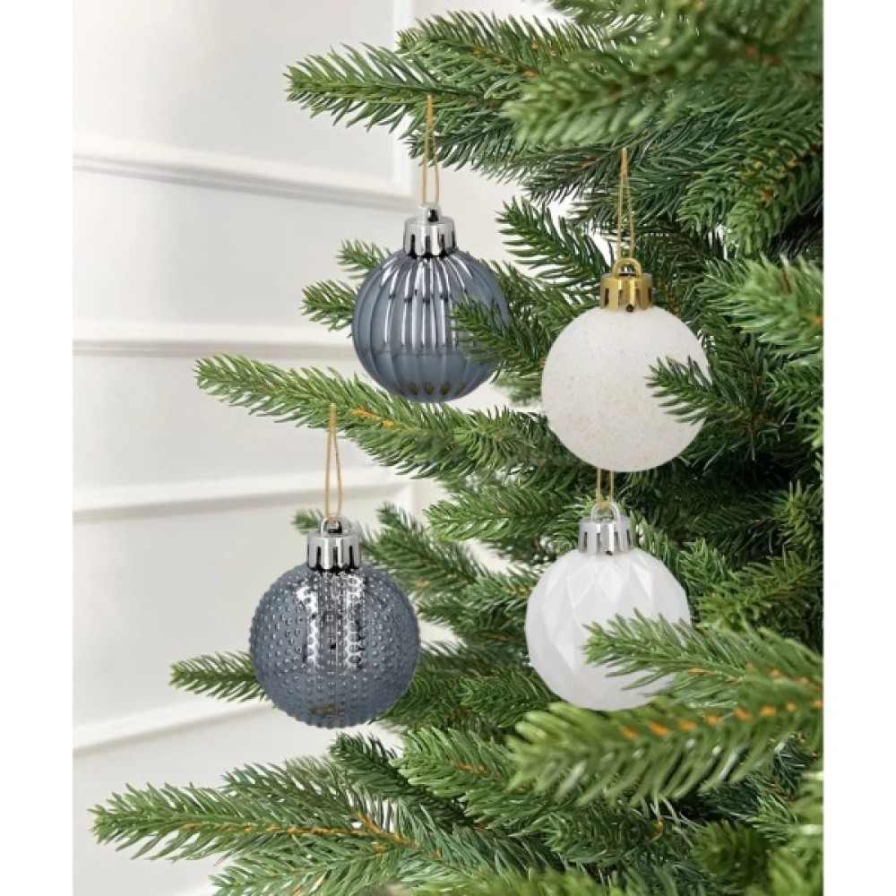 Набір ялинкових іграшок Chomik у сріблясто-білому виконанні — це елегантне доповнення до новорічного інтер'єру, яке поєднує холодну вишуканість срібла з ніжністю білого кольору. Комплект включає 16 пластикових куль діаметром 4 см, що робить його зручним як для невеликих ялинок, так і для декоративних композицій. Кожна кулька має свій унікальний вигляд: сріблясті моделі з рельєфами "смуги" та "крапки", а також білі з блискітками та візерунком "ромби".