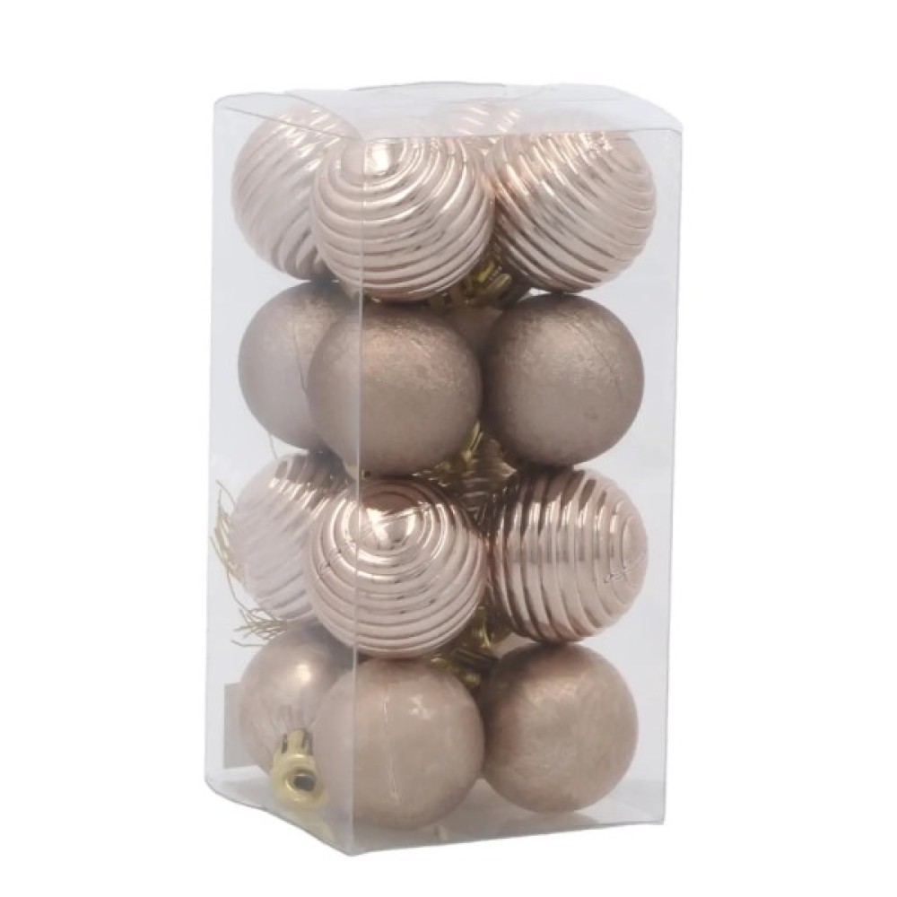 Набір Chomik у кольорі шампань — це вишуканий акцент для святкового оздоблення, який додає елегантності та тепла новорічному інтер’єру. У комплекті — 16 пластикових прикрас діаметром 3 см, що чудово підходять для декорування ялинки будь-якого розміру. Поєднання матових кульок з ефектом інею та глянцевих із горизонтальним рельєфом створює візуальну глибину та урізноманітнює загальну композицію. Завдяки легкому, безпечному матеріалу прикраси не розбиваються, що робить їх зручними для використання в родинах із дітьми або тваринами.