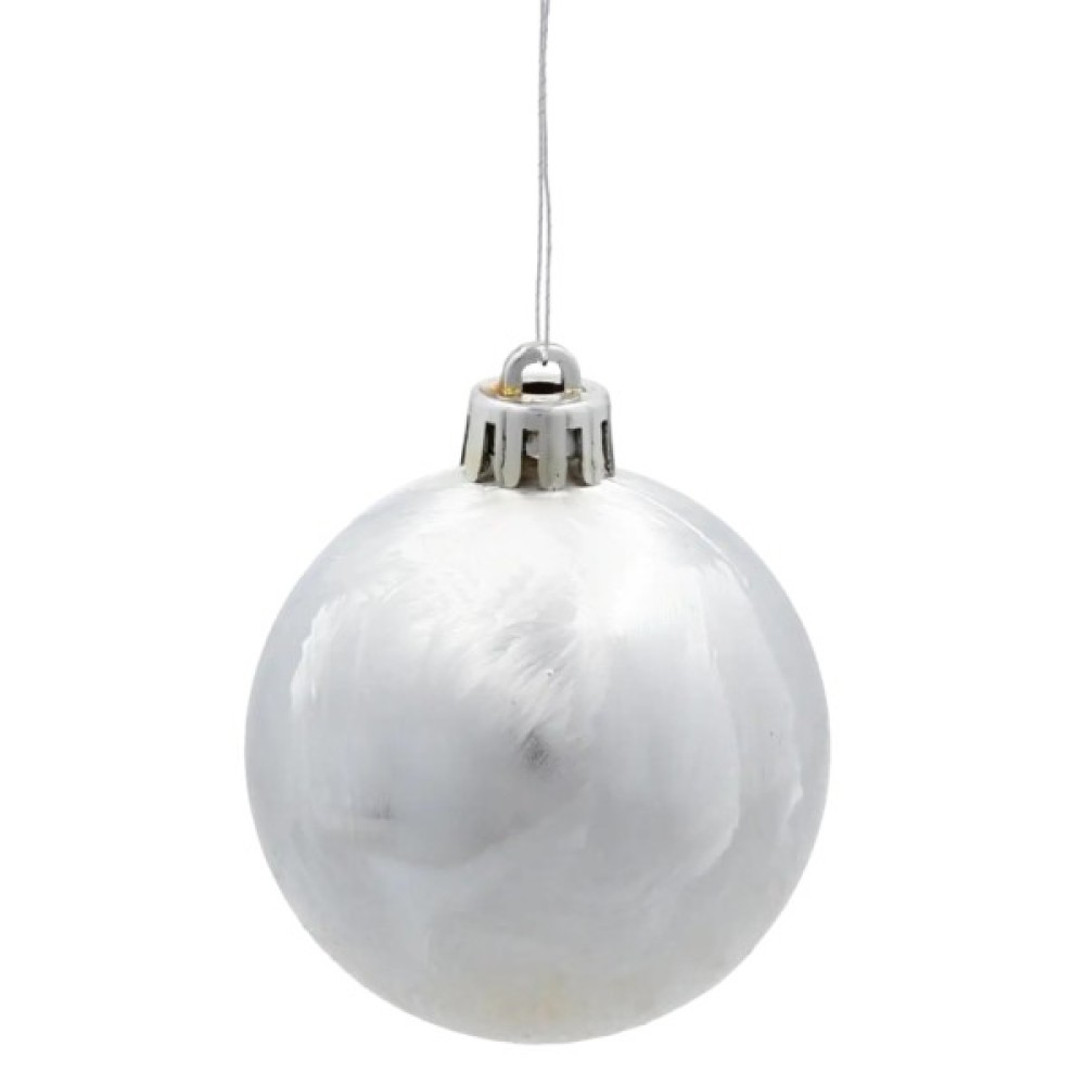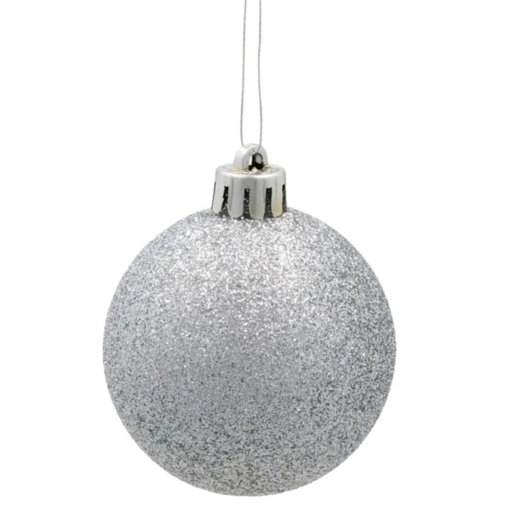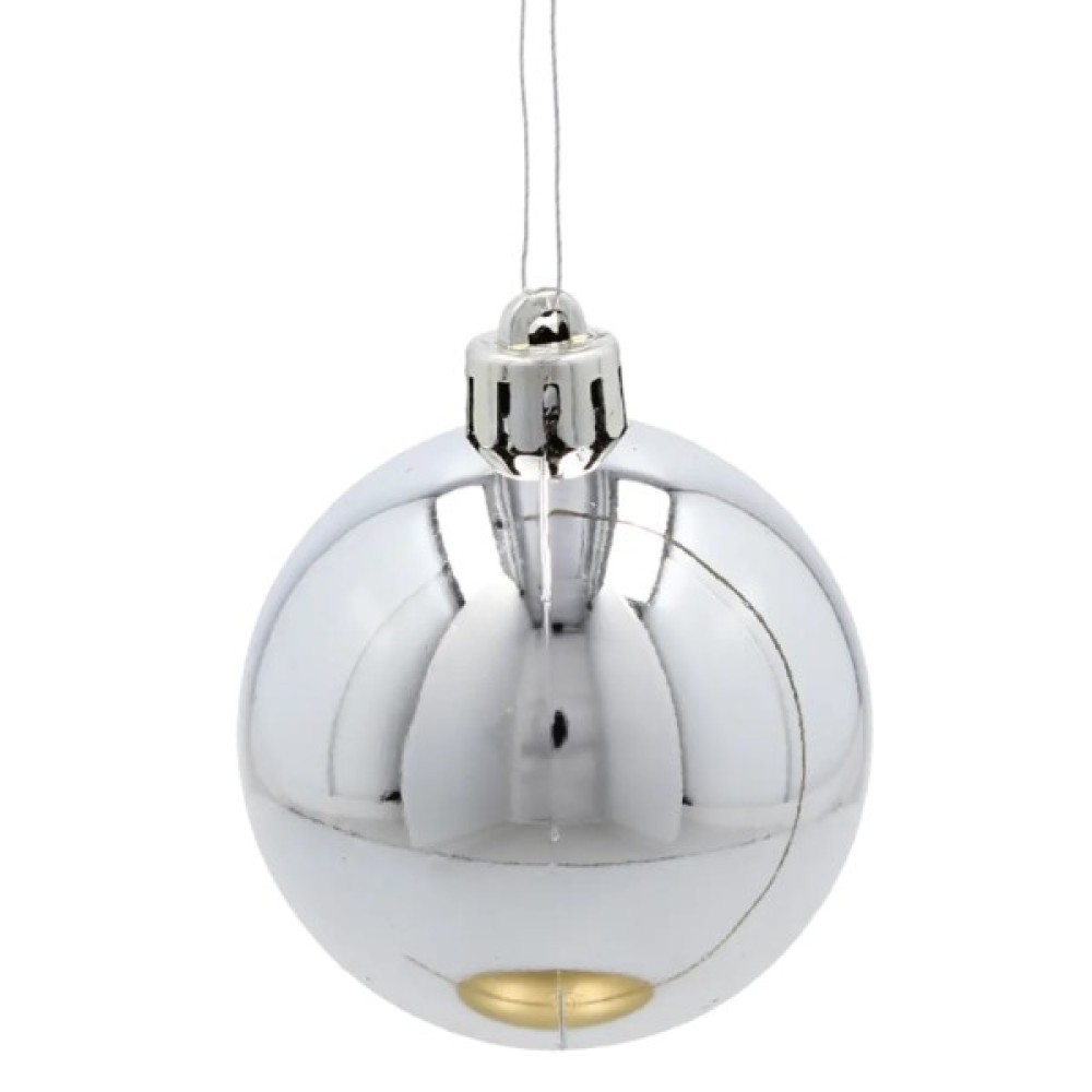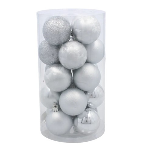 Набір ялинкових іграшок Chomik сріблястого кольору — це витончене та універсальне рішення для святкового декору з акцентом на блиск і текстурне різноманіття. У комплект входить 20 пластикових кульок діаметром 5 см, які поділяються на 4 типи: 5 глянцевих з блискітками (глітер-ефект), 5 прозорих із внутрішнім пір’ям, 5 класичних глянцевих і 5 матових. Такий підхід дозволяє створювати багатогранний візуальний ефект, де срібло грає головну роль у формуванні елегантної зимової атмосфери. Завдяки пластиковому матеріалу прикраси є легкими, безпечними та довговічними.
