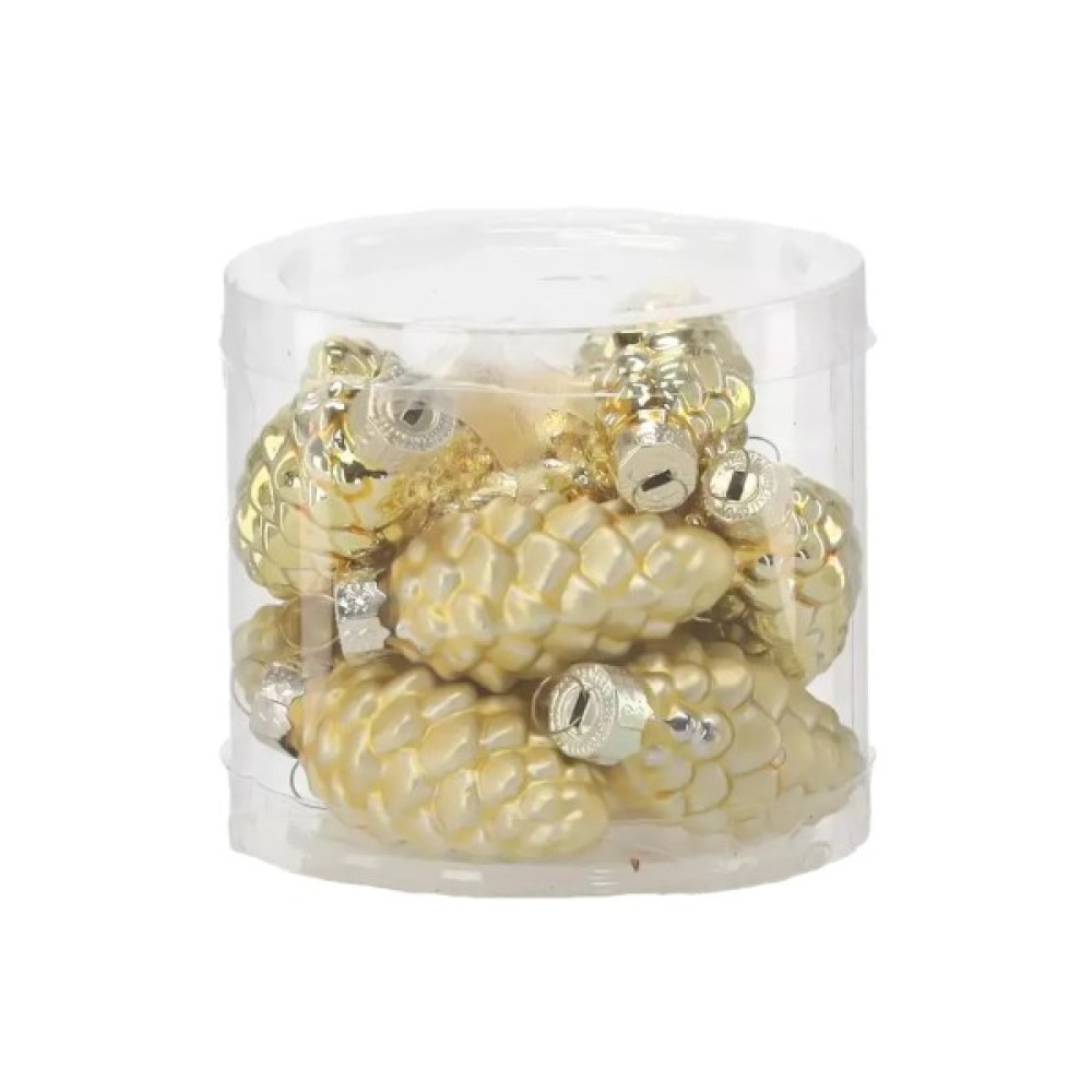 Набір Chomik у формі шишок — це витончене доповнення до святкового оздоблення ялинки, виконане в елегантному золотистому кольорі. До комплекту входить 16 скляних прикрас розміром 3×6 см: 8 матових і 8 глянцевих шишок. Така форма додає композиції природних акцентів, а різні типи покриття дозволяють створити цікаву гру світла та тіней на гілках. Вишуканий блиск скла у поєднанні з класичним кольором робить ці прикраси універсальним вибором для будь-якого новорічного стилю.