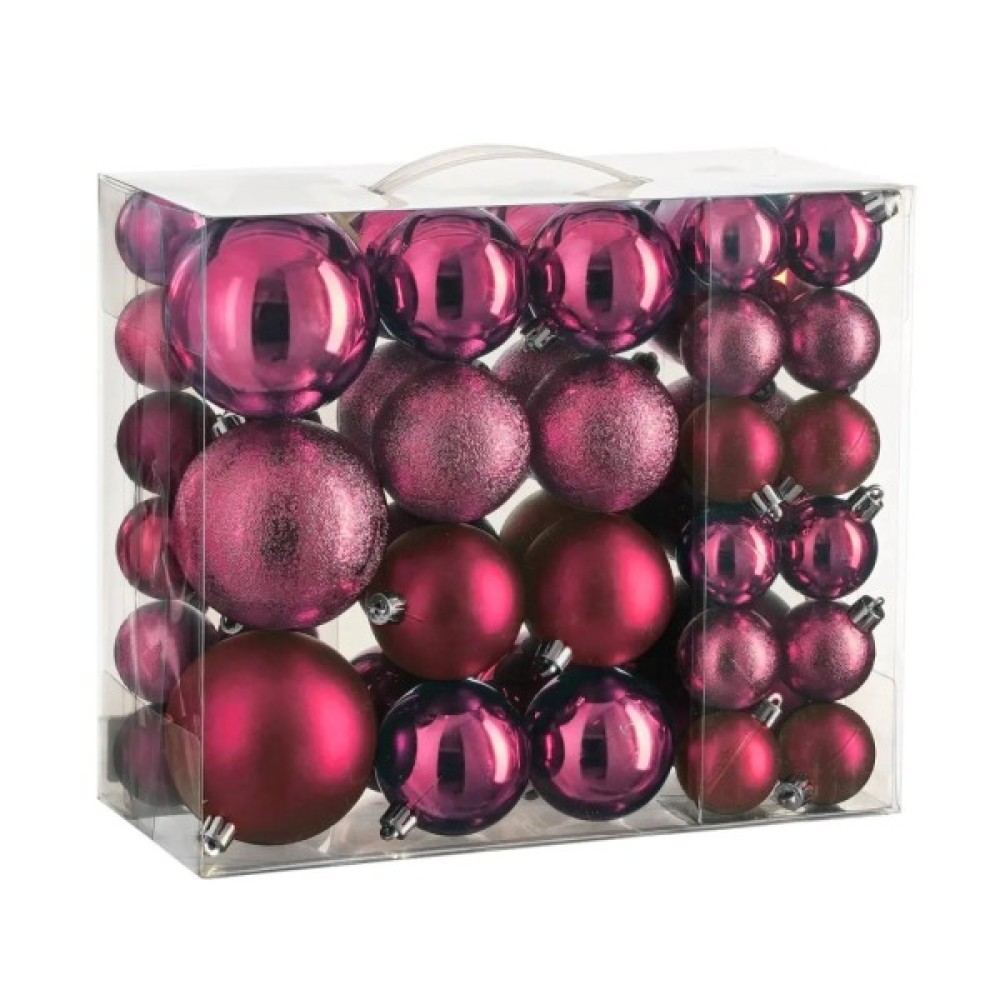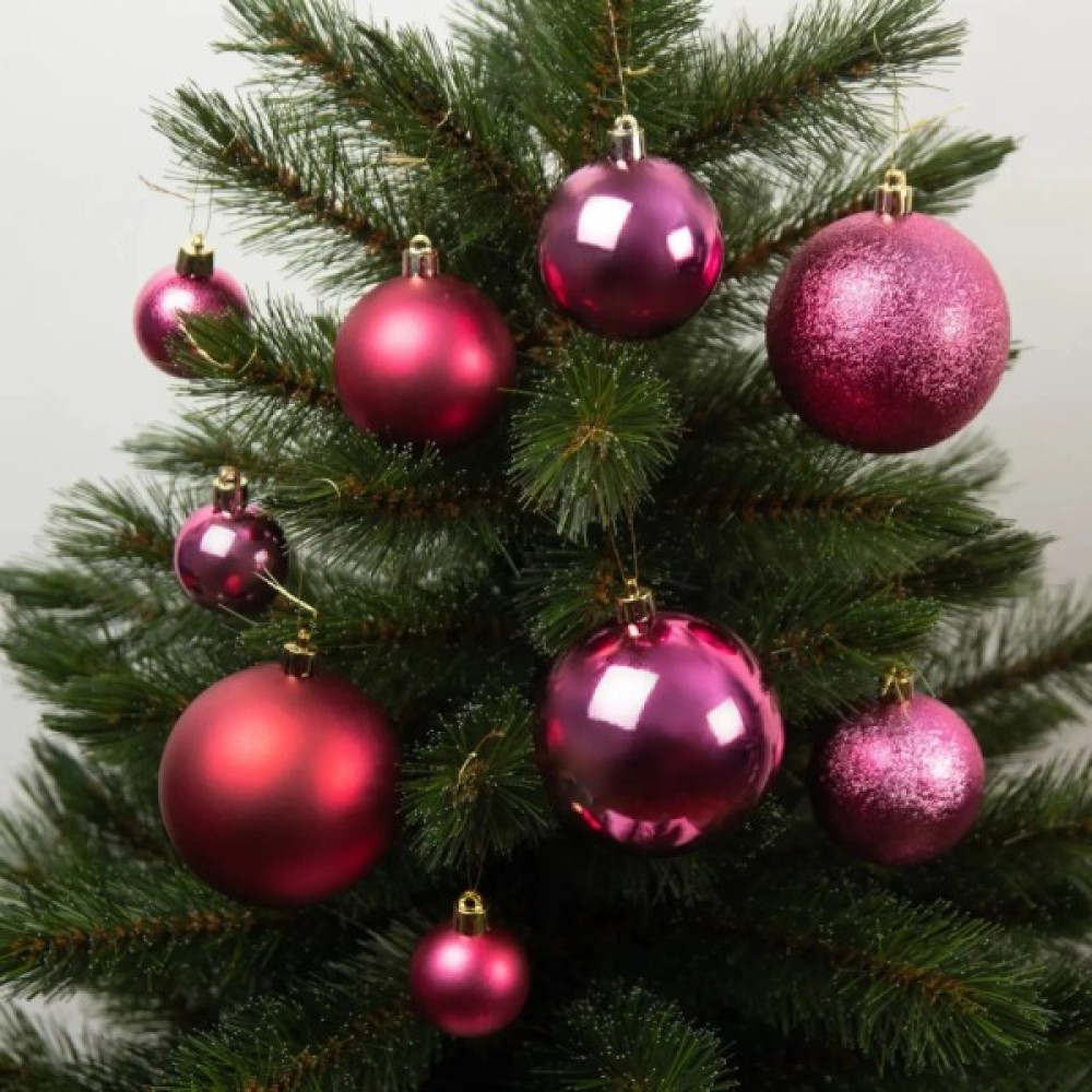 Особливістю набору є різноманіття розмірів (Ø 4/6/8 см) та покриттів (матові - 14 шт; глянцеві - 18 шт; рельєфні блискучі - 14 шт) пластикових кульок, представлених у яскравому пурпуровому відтінку*, що дозволяє привабливо оздобити новорічне дерево у повноцінну святкову композицію. Комплект особливо вдало виглядає на фоні зеленої хвої, а також впишеться у будь-який інтер'єр — залишається лише вдягнути кульки на вашу ялиночку!
