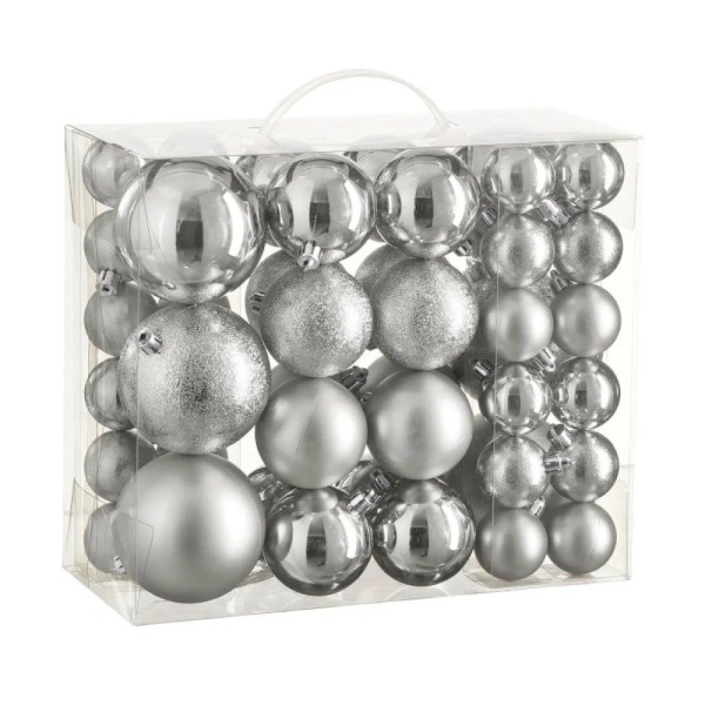 Особливістю набору є різноманіття розмірів (Ø 4/6/8 см) та покриттів (матові - 14 шт; глянцеві - 18 шт; рельєфні блискучі - 14 шт) пластикових кульок, представлених у приємному сріблястому відтінку*, що дозволяє стильно оздобити новорічне дерево у повноцінну святкову композицію. Комплект особливо вдало виглядає на фоні зеленої хвої, а також впишеться у будь-який інтер'єр — залишається лише вдягнути кульки на вашу ялиночку!