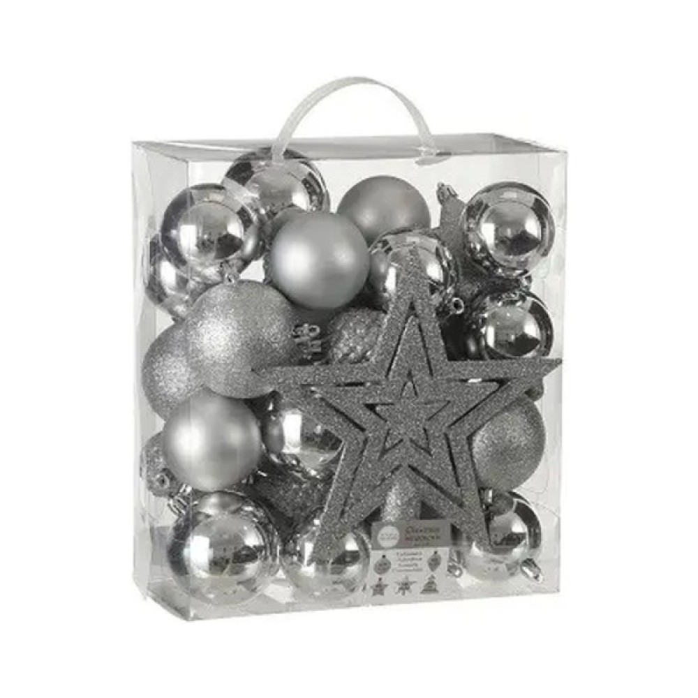 - Кульки: 17 х Ø 6 см + 9 х Ø 7 см, шишки 5 х Ø 8 см, зірки 8 х Ø 8 см, верхівка — зірка 1 х 20 см висота
