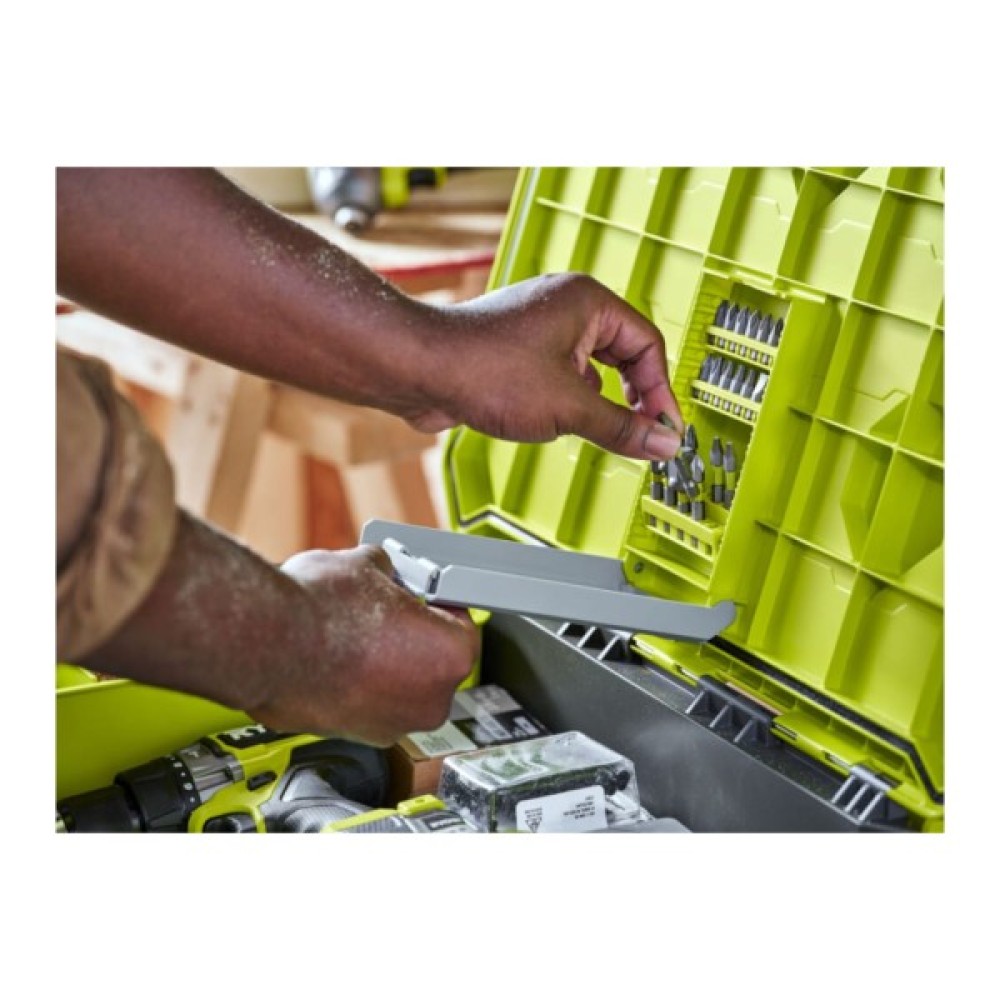 Цей ящик для інструментів має клас захисту IP65, що захищає ваші інструменти від води та пилу в будь-якому середовищі. Вбудований відсік для зберігання насадок Ryobi та подвійний контейнер-органайзер забезпечують максимальну організацію та легко закріплюють ваші речі за допомогою замка.